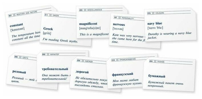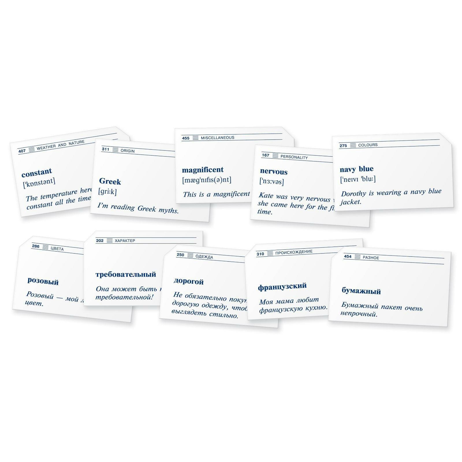 Прилагательные разделены на 8 тематических блоков и имеют сквозную нумерацию. Учить слова на карточках можно в транспорте, на пляже — везде, где есть свободная минутка и желание пополнить собственный словарный запас. С помощью этих карточек вы быстро овладеете наиболее употребительными английскими прилагательными. Перед тем как отправиться в ресторан, в отель, за покупками, пролистайте карточки по интересующей вас теме, и вы почувствуете себя намного увереннее. Мы рекомендуем учить слова двумя способами. Сначала посмотрите на английскую сторону карточки, прочитайте слово и попытайтесь вспомнить его значение. Если вспомнить перевод не удаётся, обратитесь к примеру употребления или посмотрите на обратную сторону карточки и отложите её в стопочку для повторения. Когда вы сможете вспомнить перевод каждого прилагательного, переверните стопку карточек и попробуйте перевести русские прилагательные на английский язык.