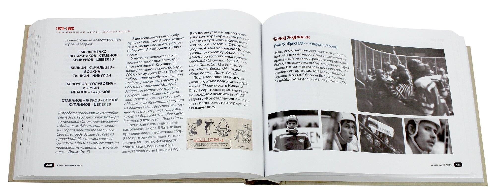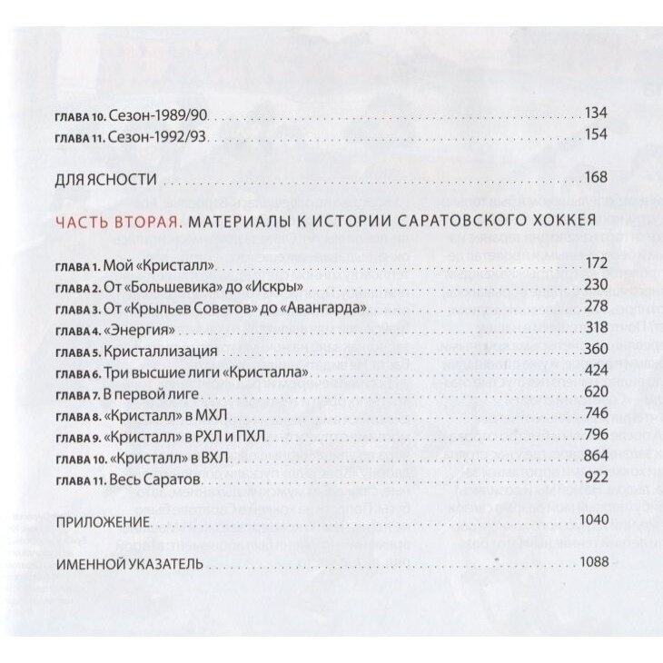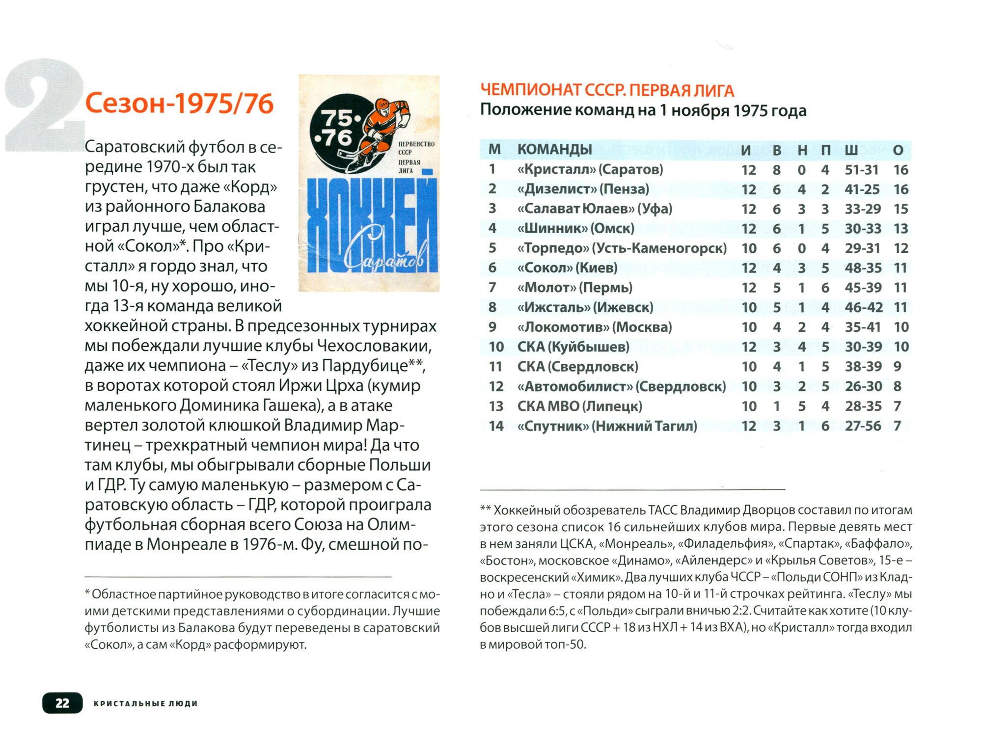 Вторая часть – подробнейшая энциклопедия, в которой, однако, фигурируют не только «голы, очки, секунды»: 70 лет истории саратовского хоккея даны в живом контексте страны и времени. Именно сочетание личных авторских воспоминаний и строгих, профессионально поданных фактов делает этот «кристалл» магическим, придавая книге стереоскопический эффект.