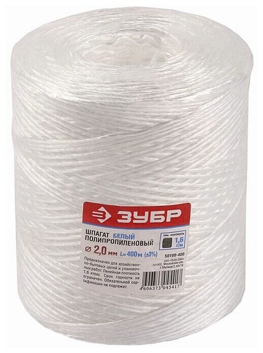 Шпагат Зубр d=2,0 мм, 400м, белый, 22 кгс, 1,6 ктекс - может быть использован в бытовых целях. Удобная в обращении, применяется в качестве обвязочного материала в различных отраслях народного хозяйства и в быту.