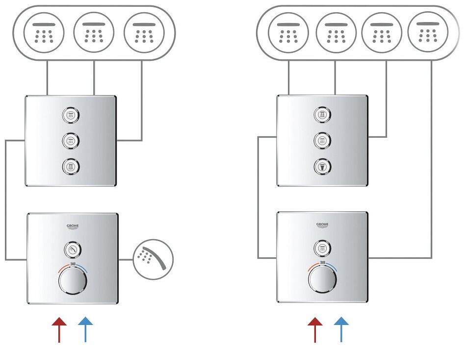 Металлическая накладная панель с GROHE QuickFix, регулируемая на 6°. GROHE StarLight хромированная поверхность. Заменяемые символы. 3 кнопки SmartControl для подключения 3-х точек водоотвода: ручной душ, верхний душ, излив для ванны. При нажатии происходит включение или выключение потока воды в выбранном устройстве, поворот кнопки регулирует напор от минимального в режиме EcoJoy до максимального. Возможно одновременное включение нескольких точек водоотвода. Распределение расхода воды: выход D - 28 л/мин, выход A - 28 л/мин, выход D+E+A - 65 л/мин