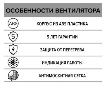 Осевой вытяжной вентилятор Era (Эра) 6S оснащен антимоскитной сеткой для защиты внутренних деталей прибора. Основную защитную функцию несет корпус устройства, выполненный из качественного пластика, внутри которого размещен компактный двигатель на подшипниках скольжения, который при перегреве перестанет функционировать.