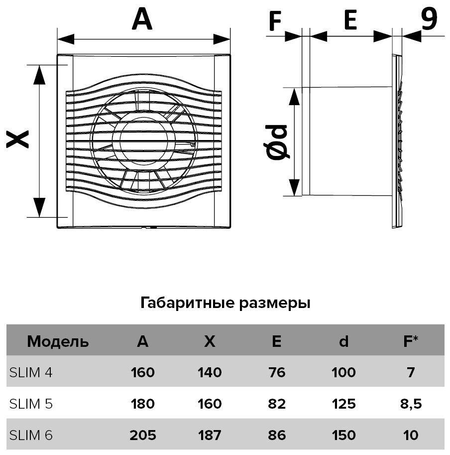 Вентилятор серии SLIM с диаметром фланца 100мм. SLIM - малошумные вентиляторы со сверхтонкой лицевой панелью. Отличаются тонкой лицевой панелью, выступающей всего на 8 мм от поверхности, на которой смонтирован вентилятор. Современные двигатели на шарикоподшипниках с увеличенным сроком службы (до 40 000 рабочих часов), защитой от перегрева и пониженным энергопотреблением от 8 Вт обеспечат эффективную и экономичную работу в течение всего срока службы.