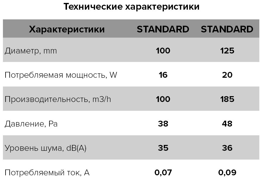 Вентиляторы серии STANDARD предназначены для монтажа в вентиляционные шахты (с прямоугольным проемом) или соединения с воздуховодами. Современный дизайн вентилятора идеально вписывается в любое интерьерное исполнение. Корпус и крыльчатка выполнены из высококачественного и прочного ABS-пластика, стойкого к ультрафиолету. Установлен двигатель на шарикоподшипниках, предназначенный для непрерывной работы и не требующий дополнительного обслуживания. Двигатель оснащен защитой от перегрева.