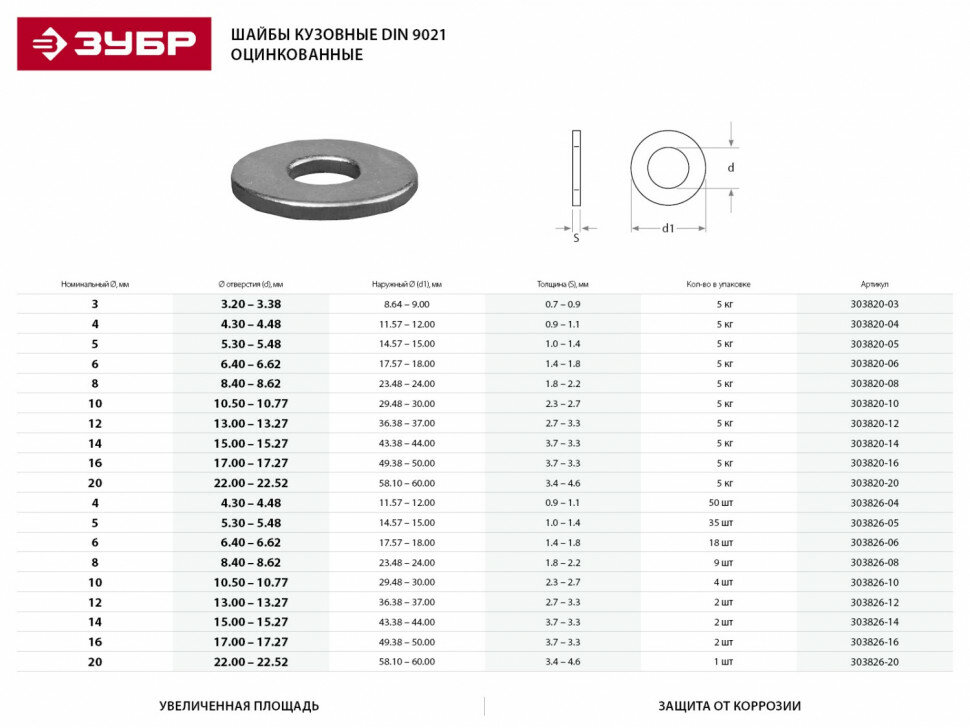 Шайба Зубр МАСТЕР кузовная, DIN 9021 предназначена для увеличения площади контакта и распределения давления на опорную поверхность. Она изготовлена из высококачественной стали и имеет цинковое покрытие, которое надежно защищает от коррозии и продлевает срок службы изделия.