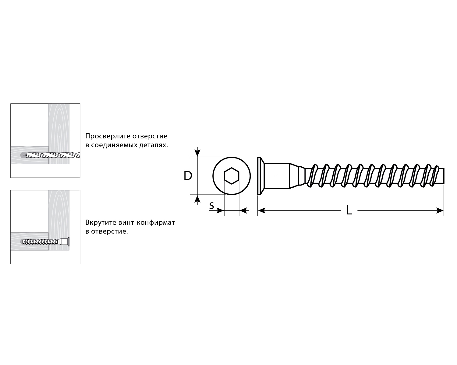 | Описание | Винт-конфиррмат представляет собой особый вид шурупа с потайной головкой и тупым наконечником. Широко применяется в мебельном производстве., , Диаметр предварительного сверления: 6.4 мм, Тип шлица: шестигранный, Материал |