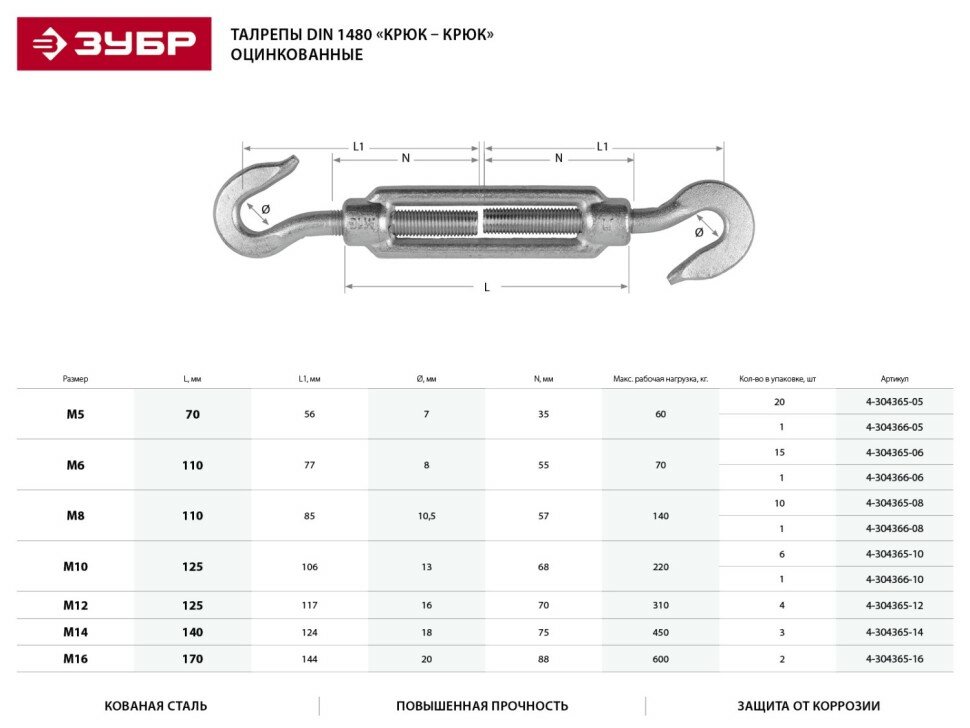 Талреп Зубр ПРОФЕССИОНАЛ изготовлен из кованой стали, что обеспечивает его повышенные прочностные характеристики. Он состоит из кованой натяжной муфты и резьбовых стержней с крюком. Цинковое покрытие защищает от коррозии и продлевает срок службы изделия. Данный такелажный крепеж применяется для регулировки натяжения цепей и тросов.