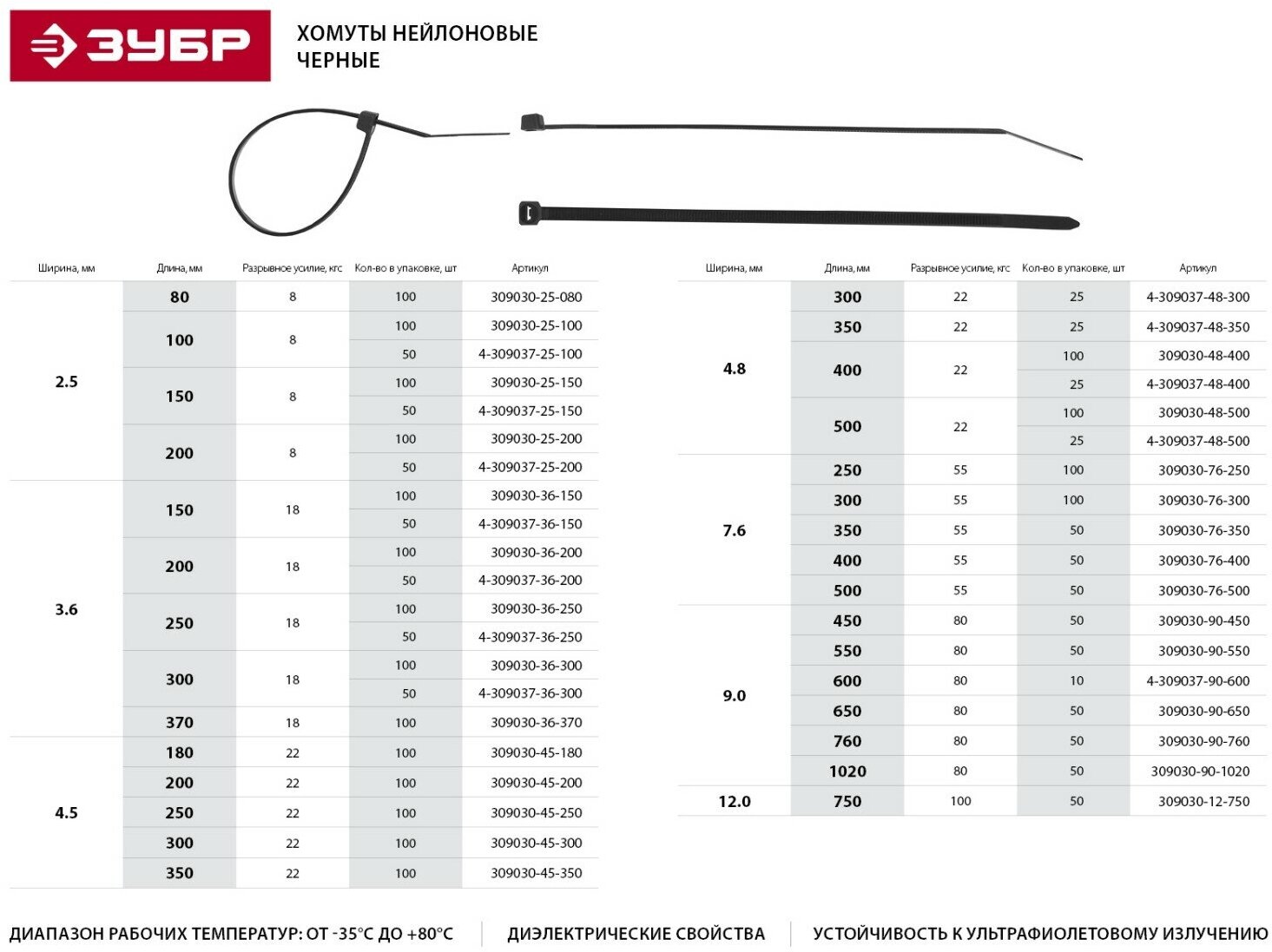 Кабельные стяжки ЗУБР КС-Ч2 Профессионал нейлоновые (РА66) черные 4.8 х 500 мм 25 шт. ()Модель - Технические характеристики:-Ширина: 4.8 мм-Длина: 500 мм-Усилие на разрыв: 22 кгс-Упаковка: 25 шт.Электромонтажный крепеж предназначен для стяжки кабелей и проводов в пучки, а также крепления электропроводки к различным поверхностям. Стяжки, клипсы, дюбель-хомуты и монтажные площадки легко, быстро и удобно монтировать как внутри, так и вне помещений. Кабельные стяжки имеют замковый механизм одностороннего хода, который может быть неразъемным или разъемным (для многоразового использования). Черные стяжки отличаются стойкостью к ультрафиолетовому излучению, поэтому рекомендуется использовать их вне помещений. Материалом стяжек является самозатухающий нейлон 6.6, не содержащий галогенов. Благодаря нейлону стяжки обладают рядом бесспорных преимуществ.Преимущества:Устойчивость к воздействию ультрафиолетового излучения;Электроизоляционные (диэлектрические) свойства;Повышенная морозоустойчивость и термостойкость;Высокая прочность и эластичность; Устойчивость к воздействию горючих и смазочных веществ и большинства химикатов;Диапазон рабочих температур от -35°С до +80°С допускает использование хомутов в самых разнообразных условиях