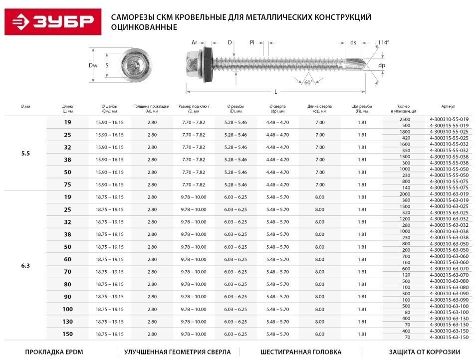 Оцинкованные саморезы для крепления кровельных материалов к деревянной обрешетке ЗУБР »