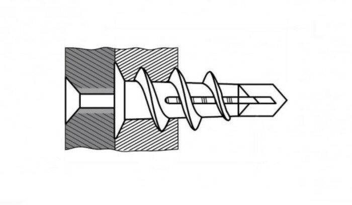 - Высокая резьба с крупным шагом увеличивает площадь контакта и фиксирует дюбель в гипсокартоне, не разрушая его