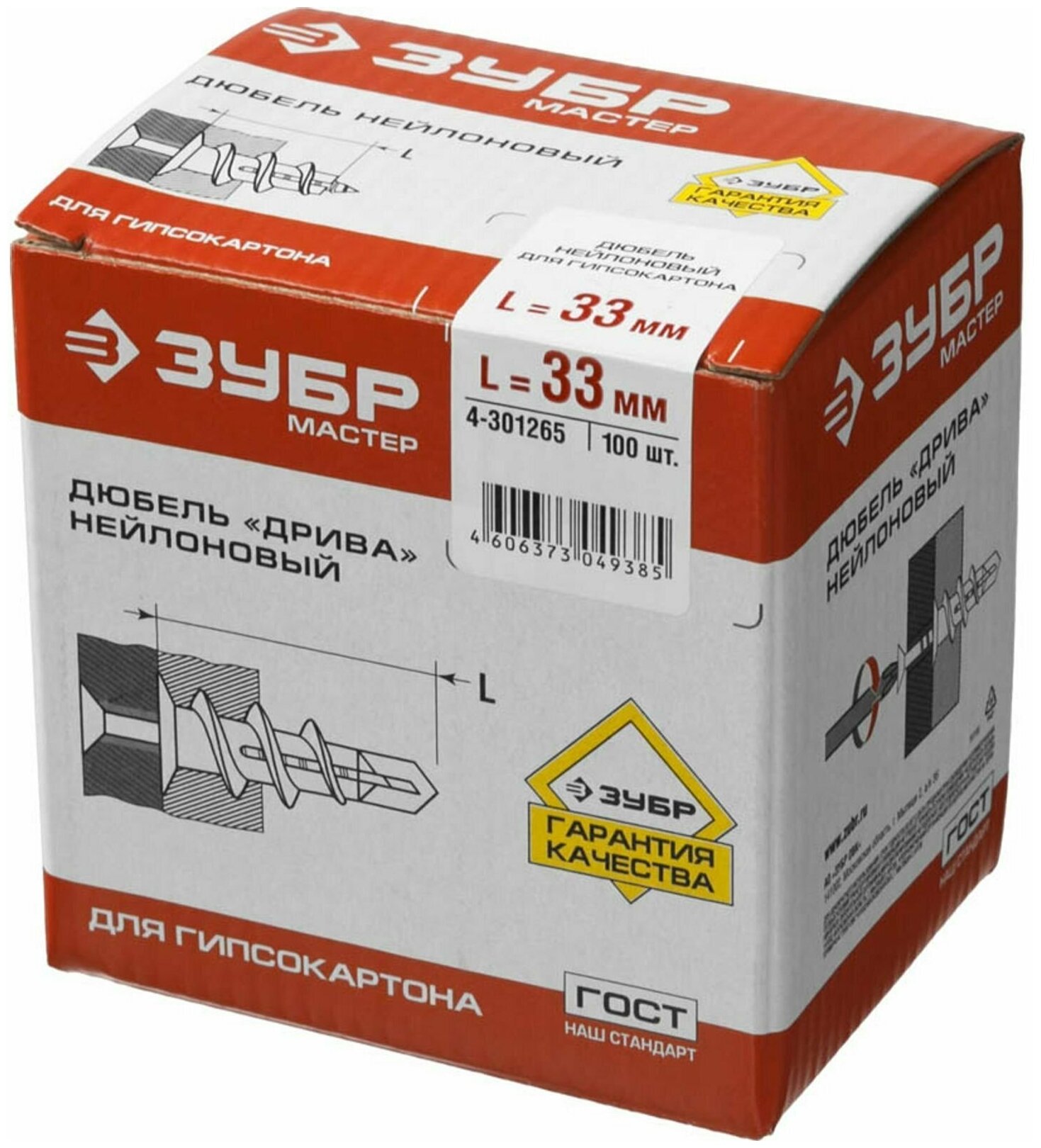 Дюбели Зубр МАСТЕР нейлоновый тип Дрива позволяет производить монтаж без предварительного сверления. Высокая резьба с крупным шагом увеличивает площадь контакта и фиксирует дюбель в гипсокартоне, не разрушая его.