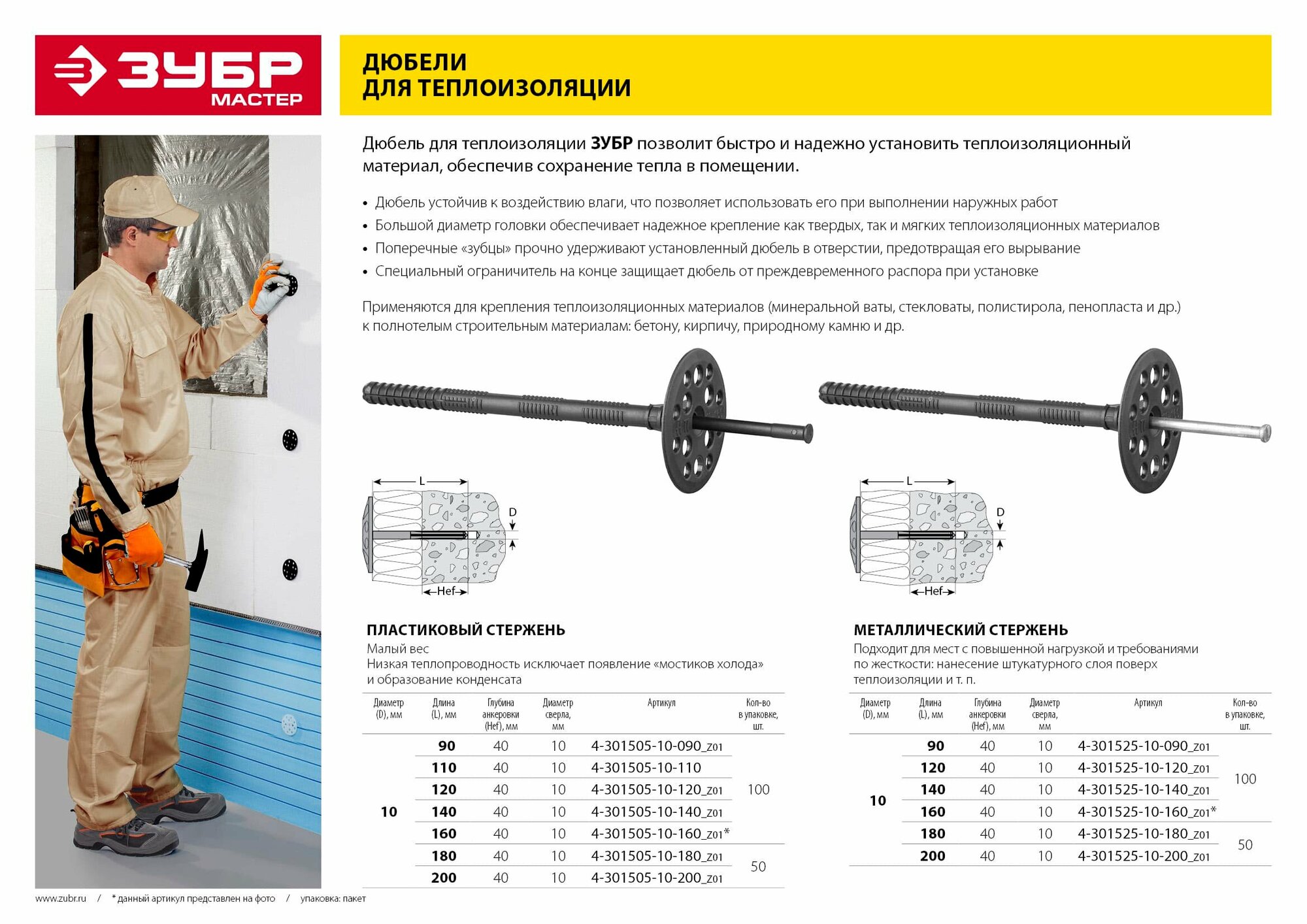 Дюбель для изоляционных материалов полипропиленовый, металлический стержень, , 100 шт, ЗУБР