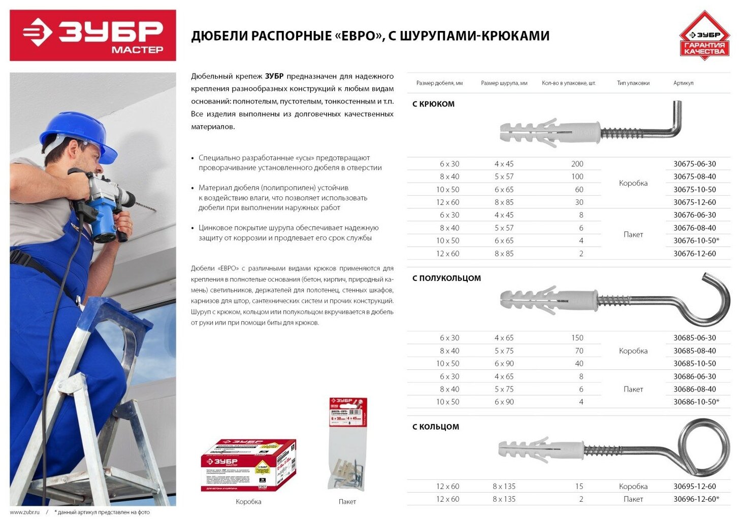 Дюбель Зубр "МАСТЕР" распорный полипропиленовый, тип "ЕВРО", в комплекте с шурупом-крюком, 8 х 40 / 5 х 57 мм широко используется в быту для крепления полок, шкафов, картин, светильников, сантехники. Дюбель устанавливается в предварительно просверленное отверстие. Крюк-полукольцо вкручивается в дюбель от руки или при помощи биты для крюков. Специально разработанные "усы" предотвращают проворачивание установленного дюбеля в отверстии. Материал дюбеля устойчив к воздействию влаги, что позволяет использовать его при выполнении наружных работ.