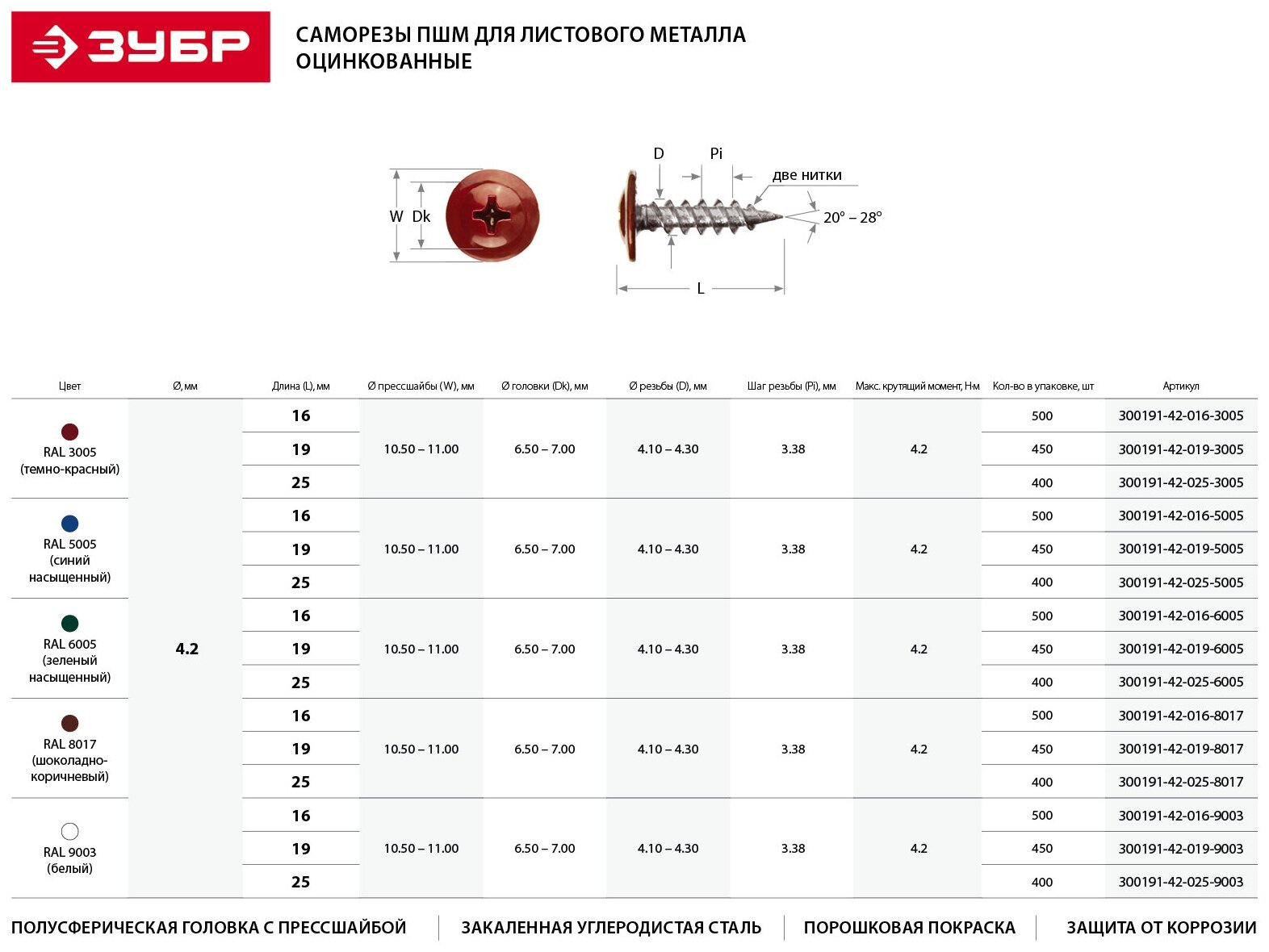 Саморезы Зубр 300191-42-019-8017 изготовлены из высококачественной стали, прошедшей термическую обработку. Наличие пресс-шайбы позволяет использовать саморез для соединения мягких материалов. Широко применяются при сборке и установке различных конструкций.