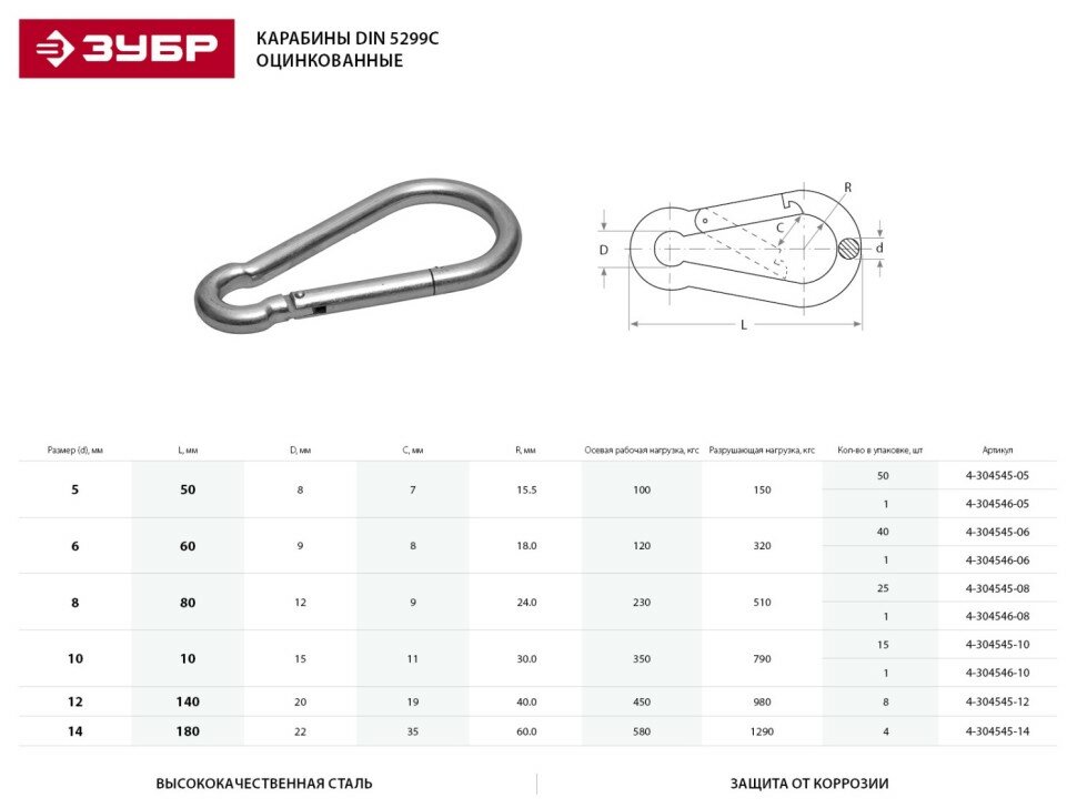 Оцинкованный карабин ЗУБР Din 5299С 8мм 25 шт