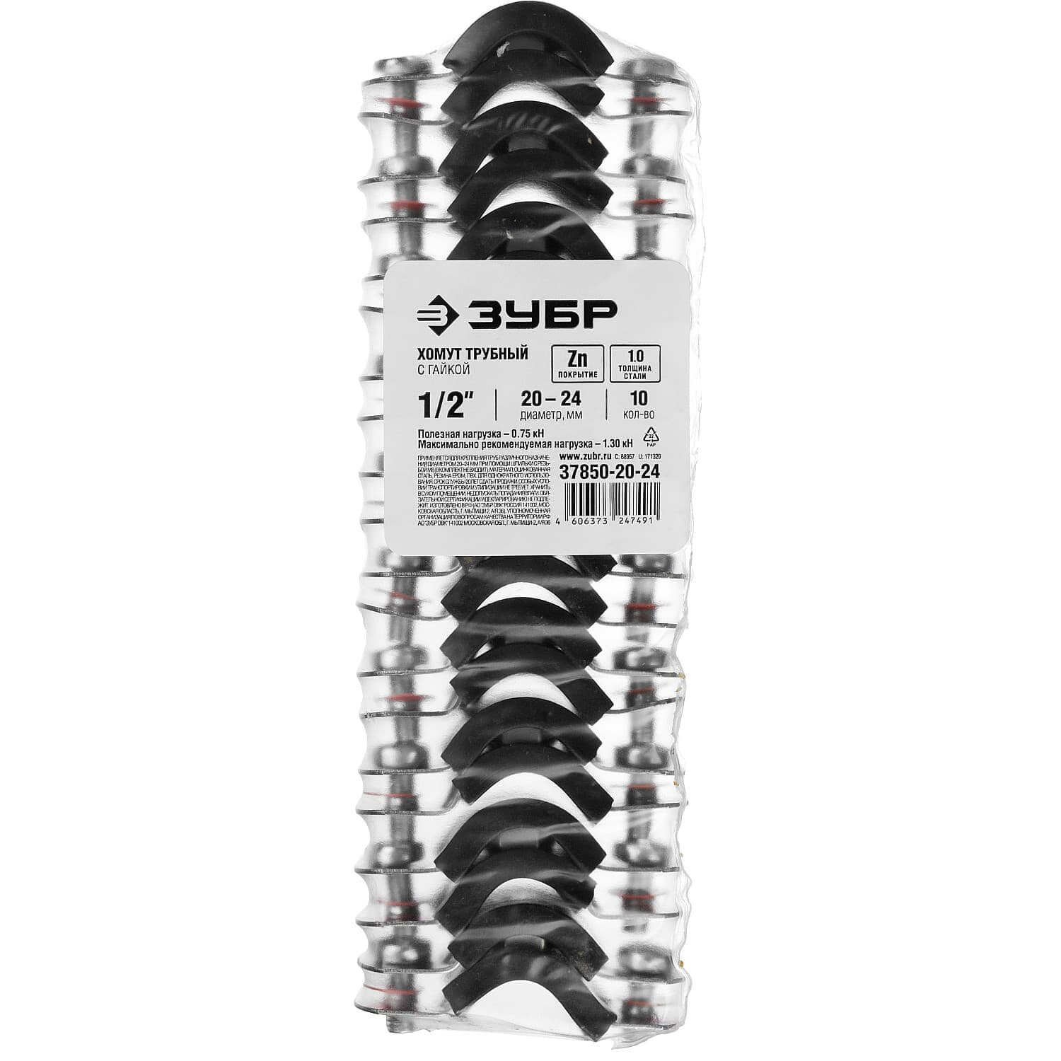 Хомут трубный с гайкой, 1/2", 10шт, оцинкованный, ЗУБР