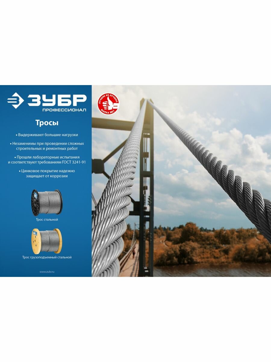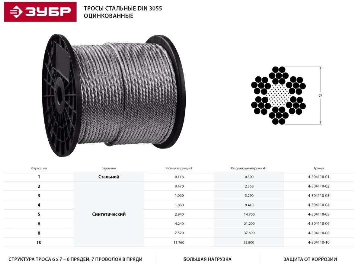 Трос стальной оцинкованный DIN 3055 ЗУБР 4-304110-01, предназначен для использования в бытовых нуждах и при проведении строительных работ в качестве подвесок, растяжек и т. п. Трос имеет структуру 6х7 и синтетический сердечник, придающий изделию эластичность и меньший вес. Тросы способны выдерживать большие нагрузки при деформации и растяжении, что делает их незаменимыми при проведении сложных строительных и ремонтных работ. НЕ использовать в грузоподъемных механизмах, для перемещения грузов и при такелажных работах!