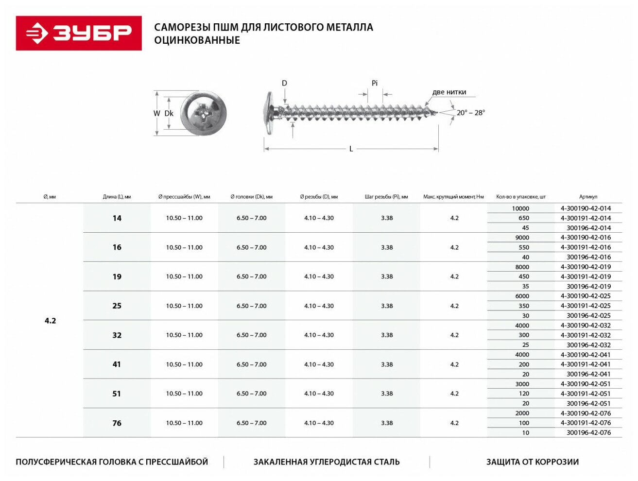 Саморезы ЗУБР ПШМ для листового металла 16x4.2мм 9 000 шт