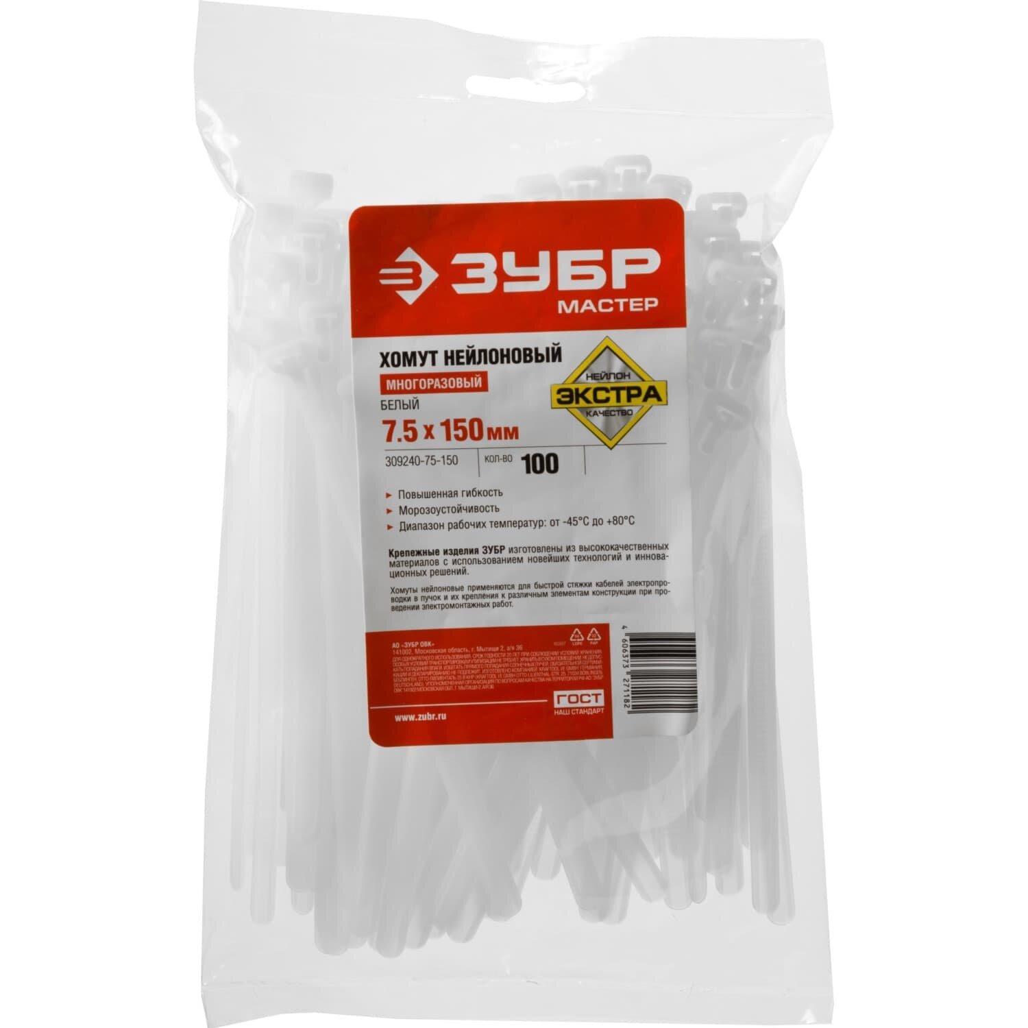 Нейлоновые хомуты ЗУБР 7.5 x 150 мм 100 шт многоразовые