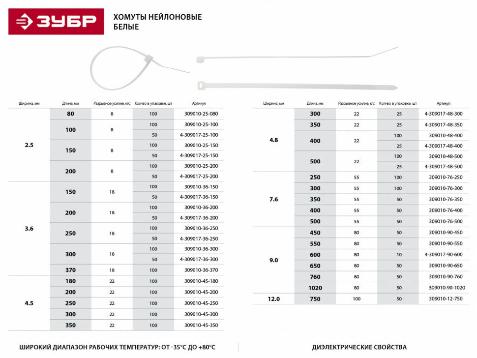 - Диапазон рабочих температур от -35°С до +80°С допускает использование стяжек в самых разнообразных условиях. Монтаж должен производится при температуре от -0°С до +60°С
