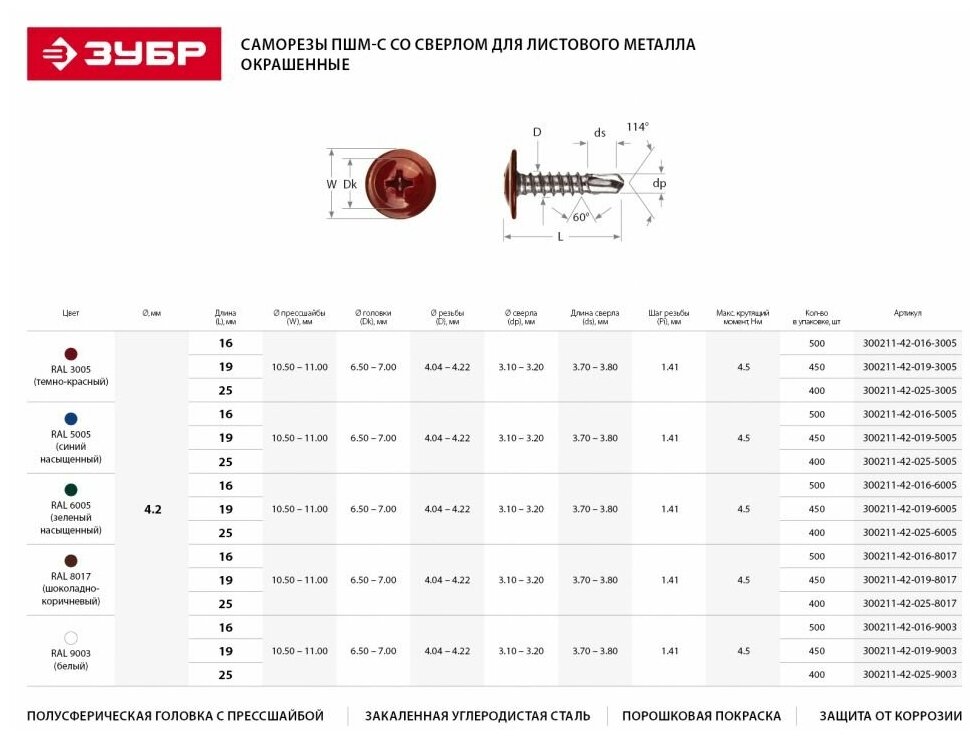 Саморезы Зубр 300211-42-025-3005 изготовлены из стального прутка с высоким содержанием углерода. Они легко вкручиваются обычным шуруповертом или отверткой. Предварительное сверление в скрепляемых материалах не требуется.