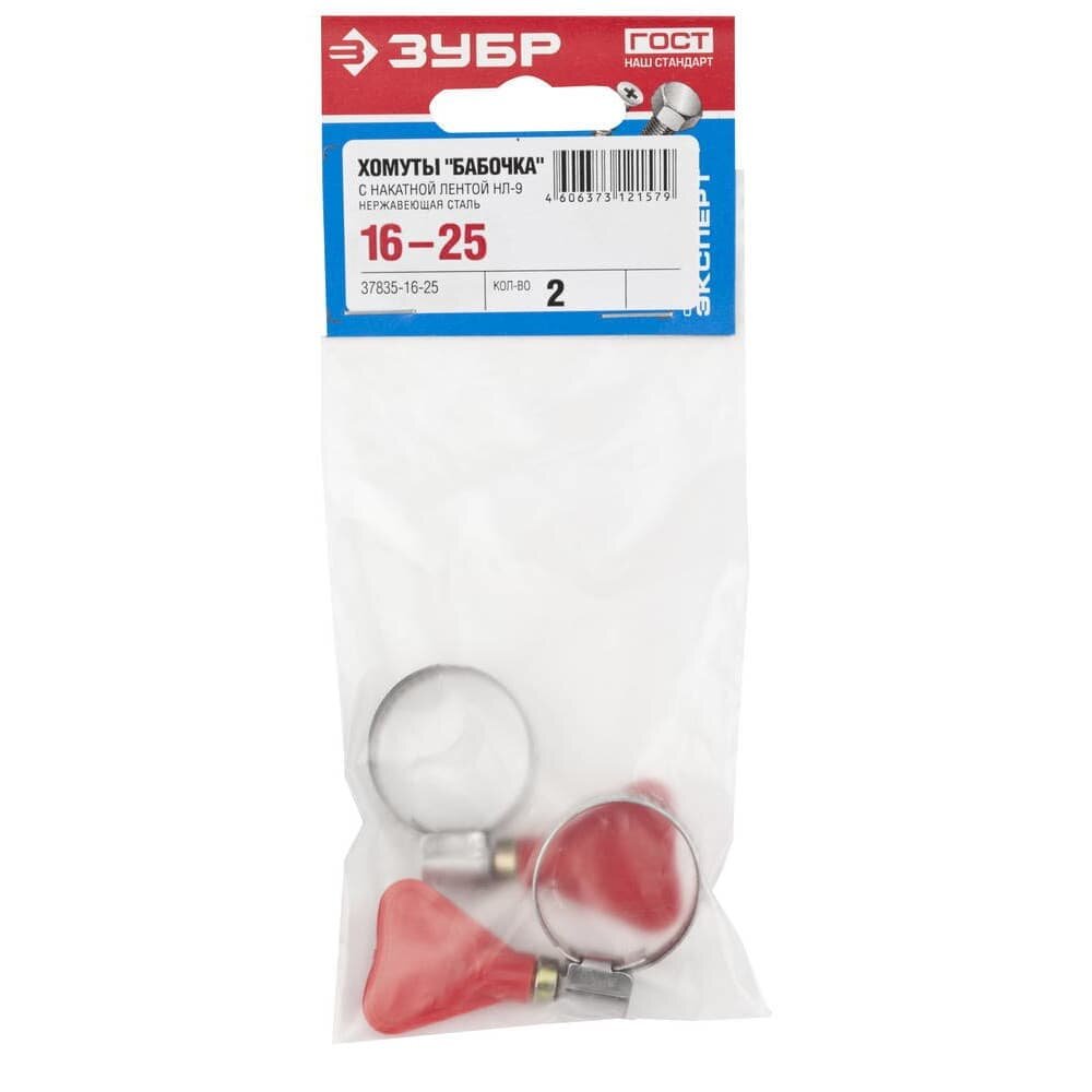 Хомуты "Бабочка", нерж. сталь, накатная лента 9 мм, 16-25 мм, 2 шт, ЗУБР Профессионал