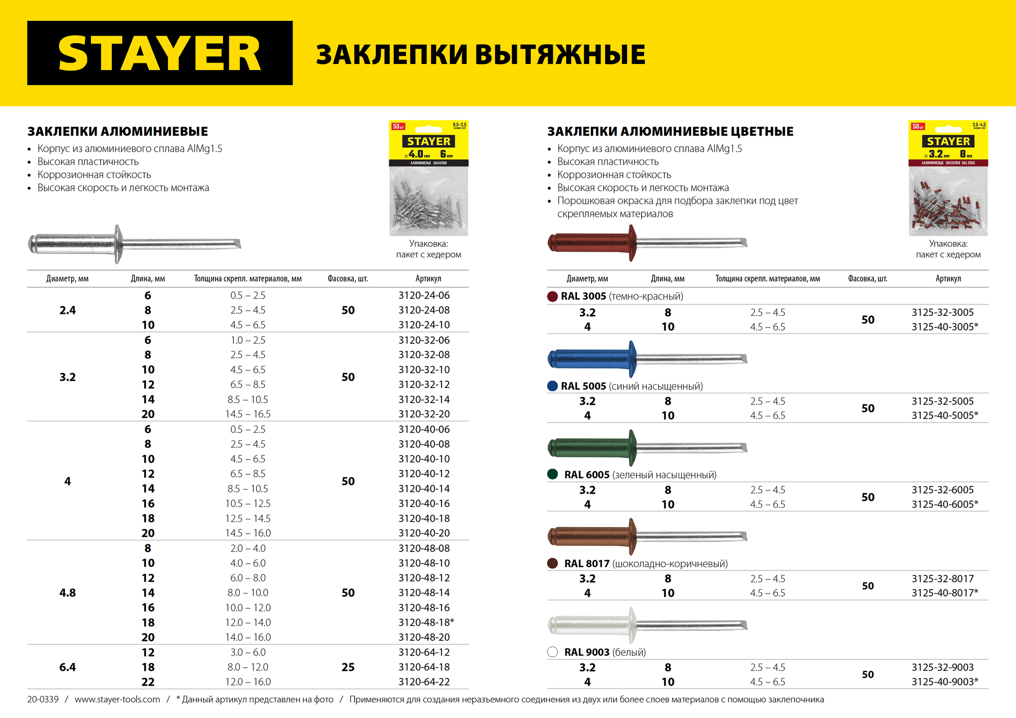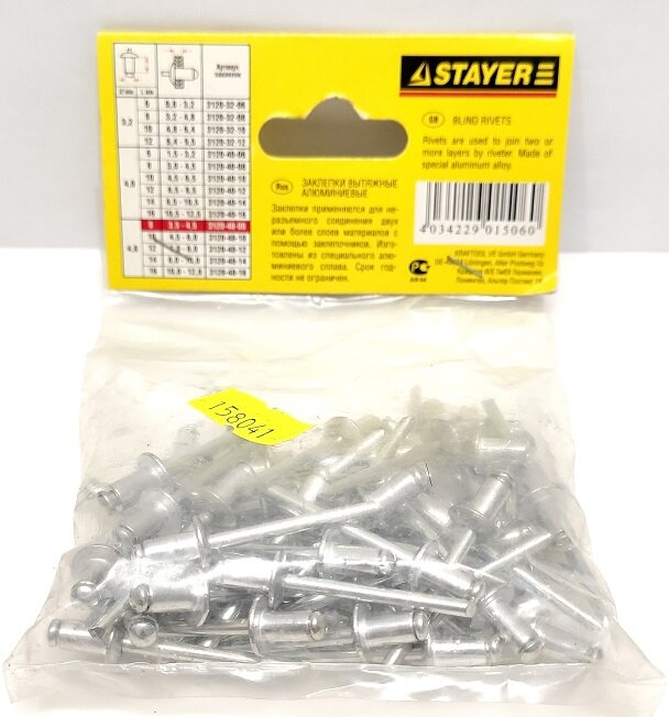 Широкий размерный ряд заклепок Stayer позволяет скреплять листовые материалы разной толщины. Использование вытяжных заклепок при монтаже существенно сокращает время работы. Для установки заклепок требуется заклепочник и доступ с одной стороны скрепляемых материалов.