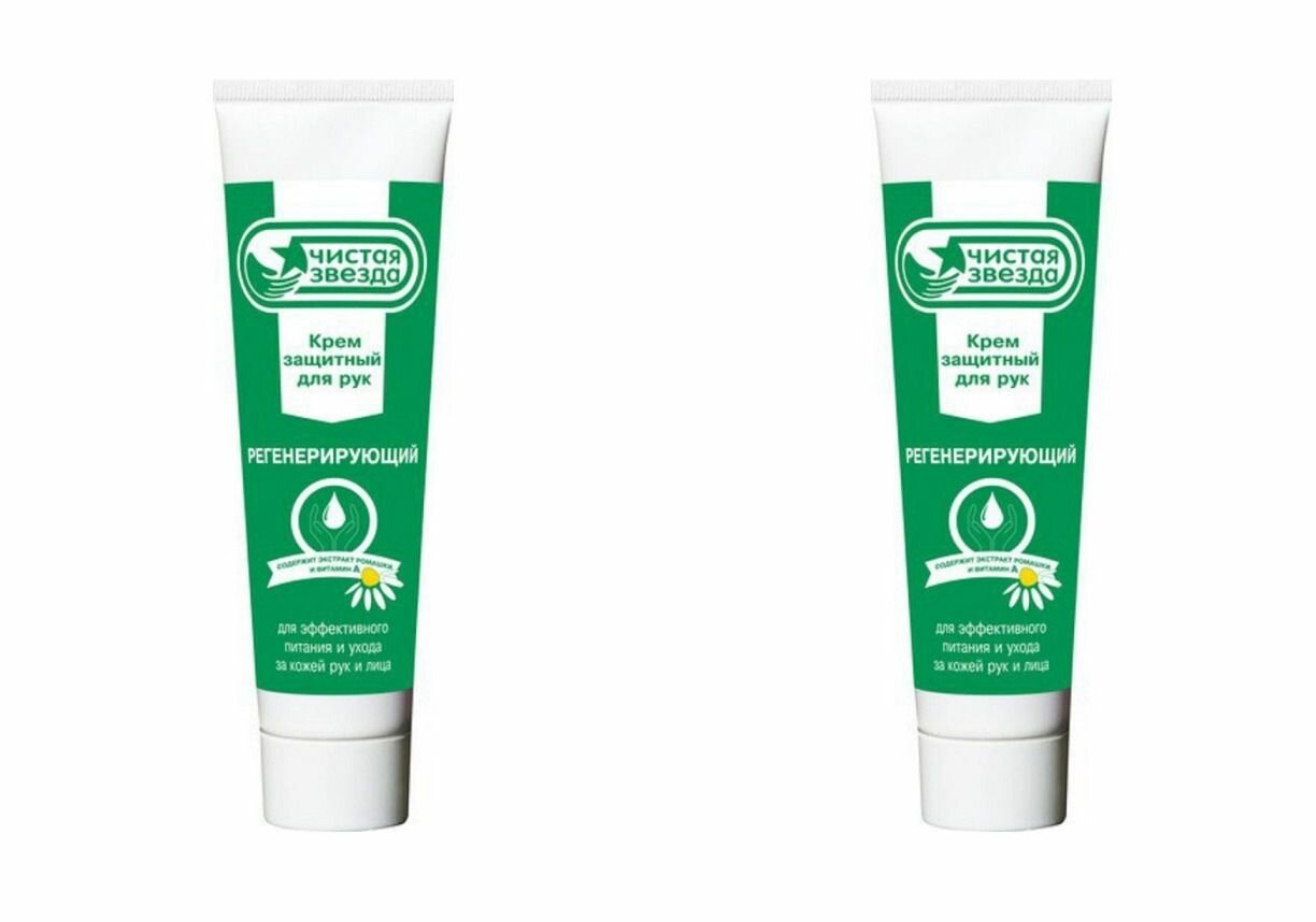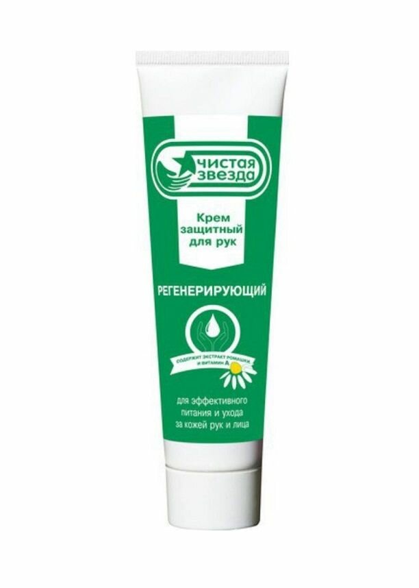 Крем защитный для рук регенерирующий Чистая звезда туба 100 мл. Для эффективного питания и ухода за кожей рук и лица Крем предназначен для питания, смягчения, увлажнения и эффективной регенерации кожи рук и лица после выполнения работ, связанных с применением веществ раздражающего действия. Благодаря высокому содержанию ланолина и натуральных масел крем устраняет последствия раздражающего действия рабочих веществ. Не препятствует дыханию кожи. Не содержит силикона. В комплекте: 2 шт.