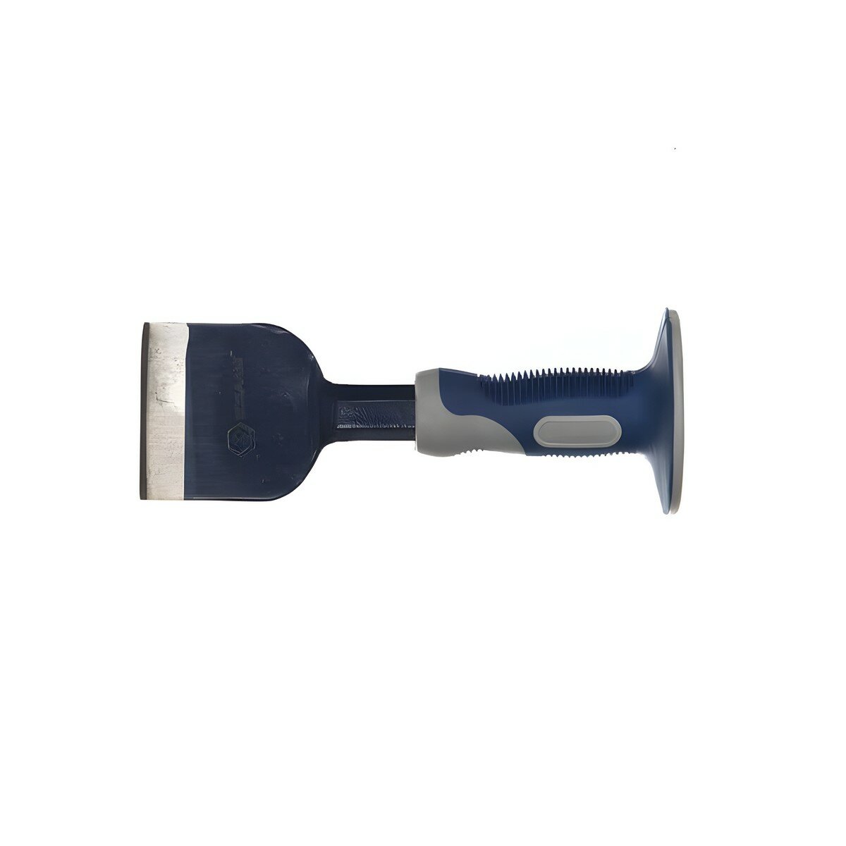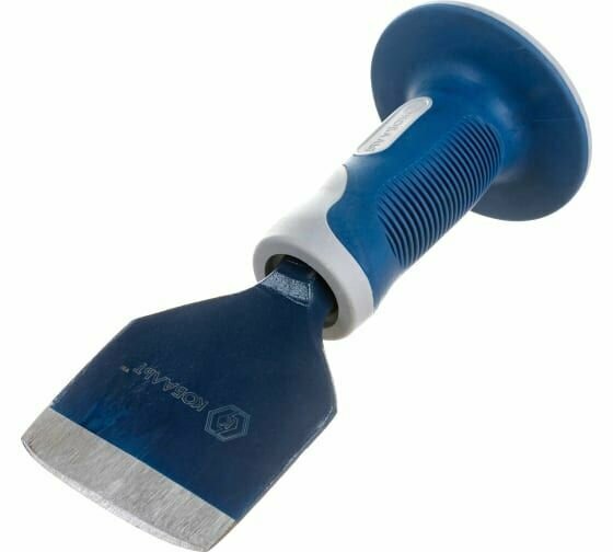 Зубило-конопатка 44х215 с протектором кобальт имеет специальное покрытие на рукоятке, которое позволяет работать более эффективно: снижается уровень скольжения ладони, а протектор защищает пальцы от попадания молотка или иного инструмента.