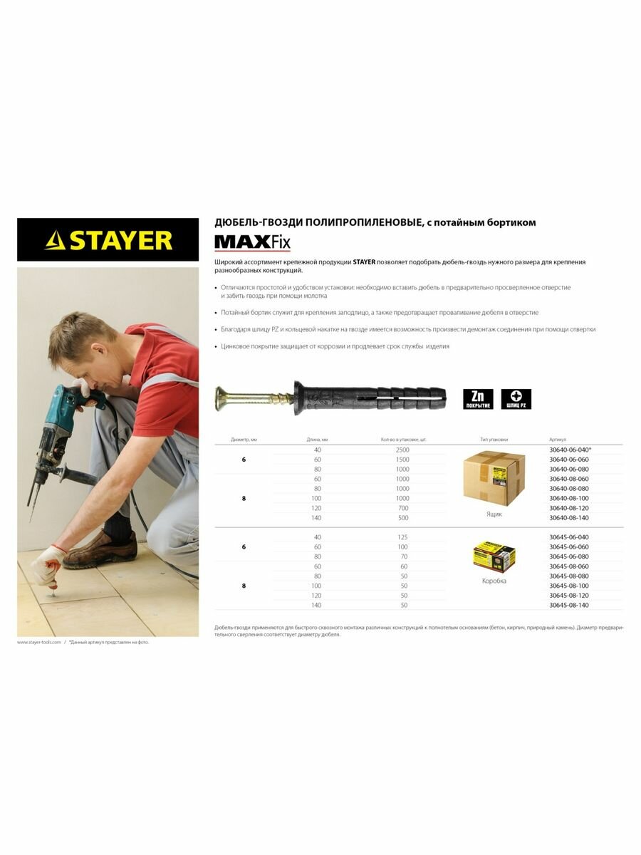 Широкий ассортимент крепежной продукции STAYER позволяет подобрать дюбель-гвоздь нужного размера для крепления разнообразных конструкций.Дюбель-гвозди применяются для быстрого сквозного монтажа различных конструкций к полнотелым основаниям (бетон, кирпич, природный камень).Дюбель-гвозди отличаются простотой и удобством в установке: необходимо вставить дюбель в предварительно просверленное отверстие диаметром 6 мм и забить гвоздь при помощи молотка;Потайной бортик служит для осуществления крепления заподлицо, а также предотвращает проваливание дюбеля в отверстие;Благодаря шлицу PZ и кольцевой накатке на гвозде имеется возможность произвести демонтаж соединения при помощи отвертки;Цинковое покрытие защищает от коррозии и продлевает срок службы изделия.