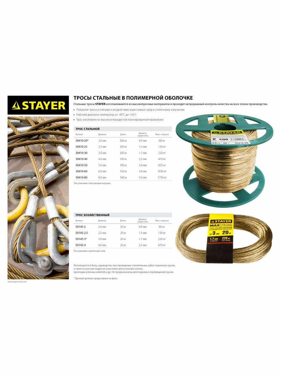 Стальные тросы STAYER изготавливаются из высокопрочных материалов и проходят непрерывный контроль качества на всех этапах производства.Используются в быту, садоводстве, при проведении строительных работ, перевозке грузов, а также в качестве подвесок и растяжек для установки антенн, прокладки уличных кабелей и др. Не предназначены для подъема и перемещения грузов