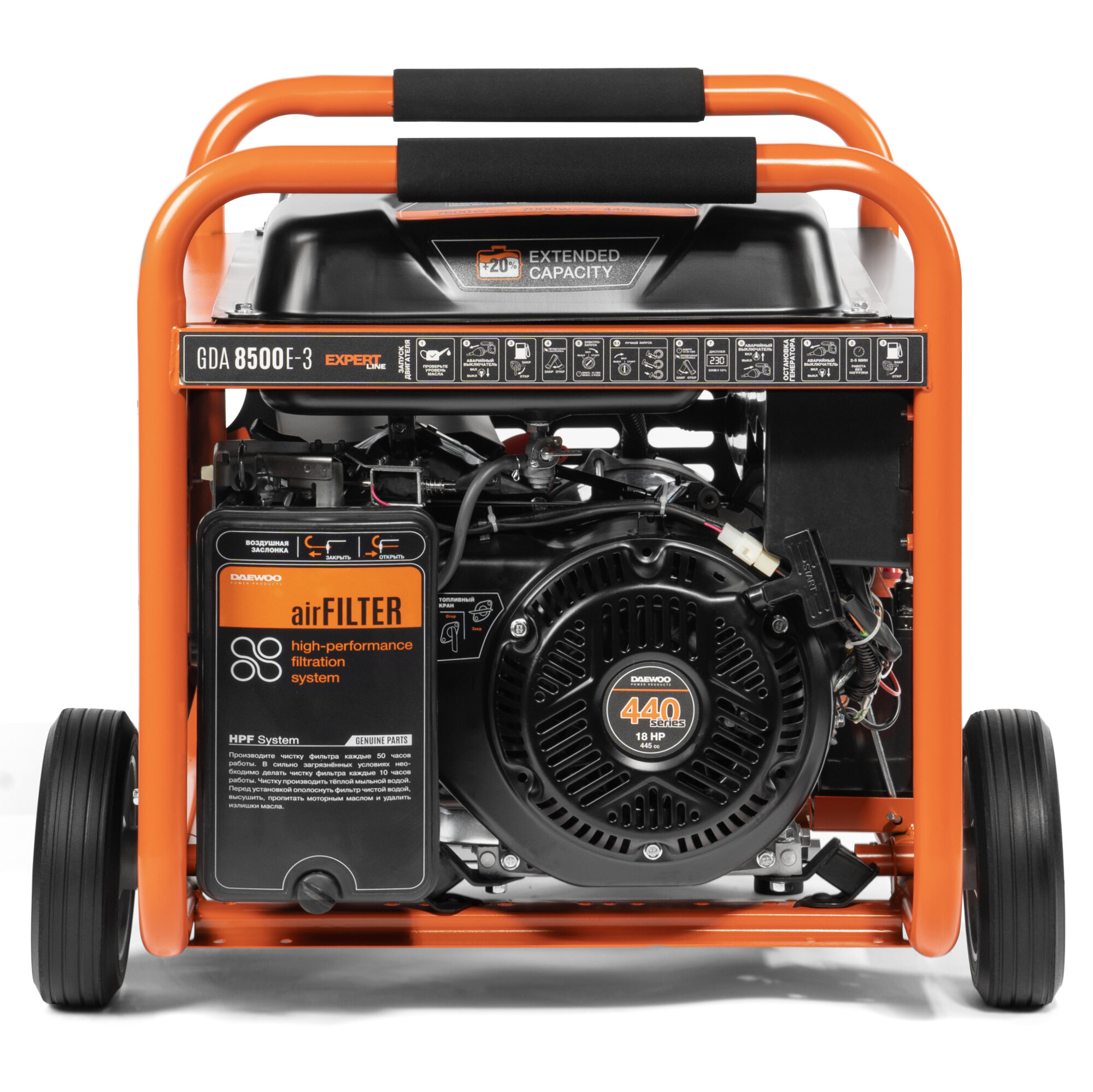 Инструкция по эксплуатации Бензиновый генератор Daewoo GDA 8500 E-3 оснащен мощным 4-х тактным двигателем с электронным запуском. Устройство обеспечит энергией электроприборы общей мощностью до 7,5 кВт. Используется в загородных домах, на частных участках и строительных площадках в качестве временного или резервного источника электричества. Аппарат включится автоматически при отключении внешней электросети, защищая дорогую технику от поломок и снабжая объект электроэнергией.