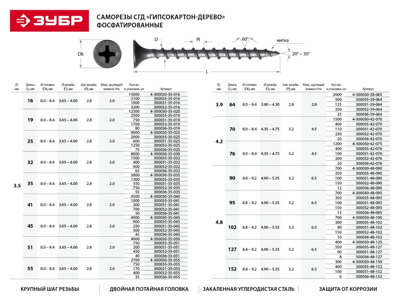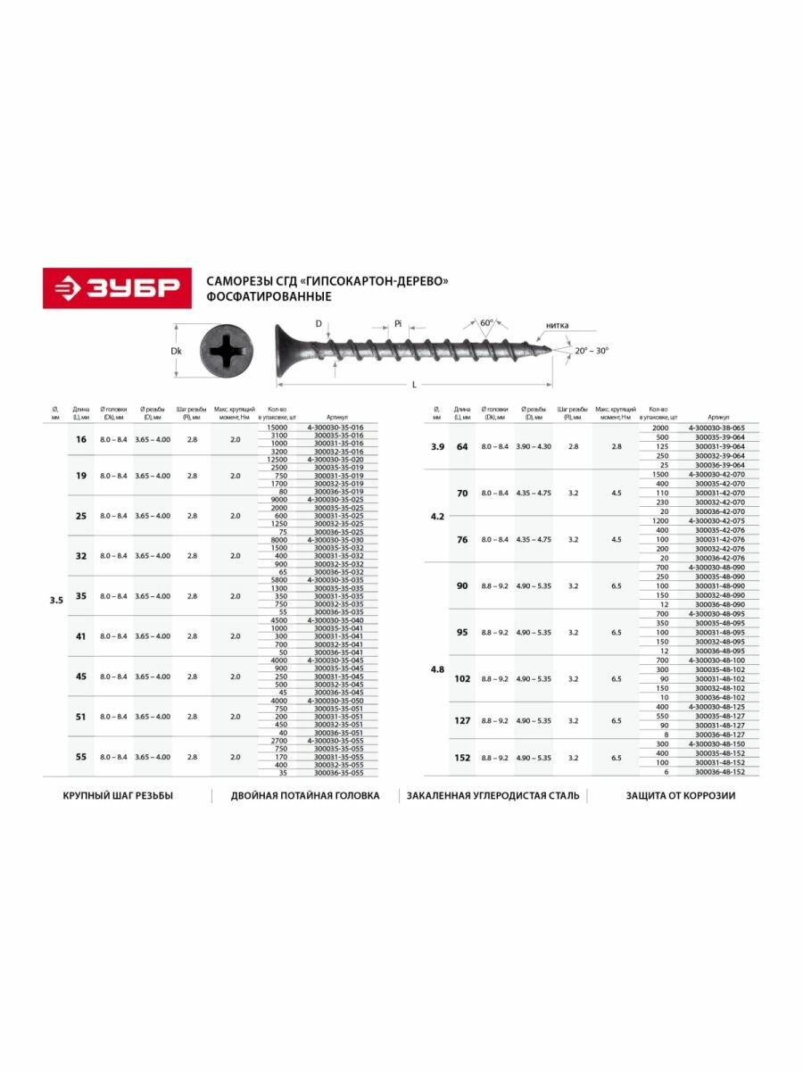 Фосфатированные саморезы по дереву ЗУБР 300036-35-032