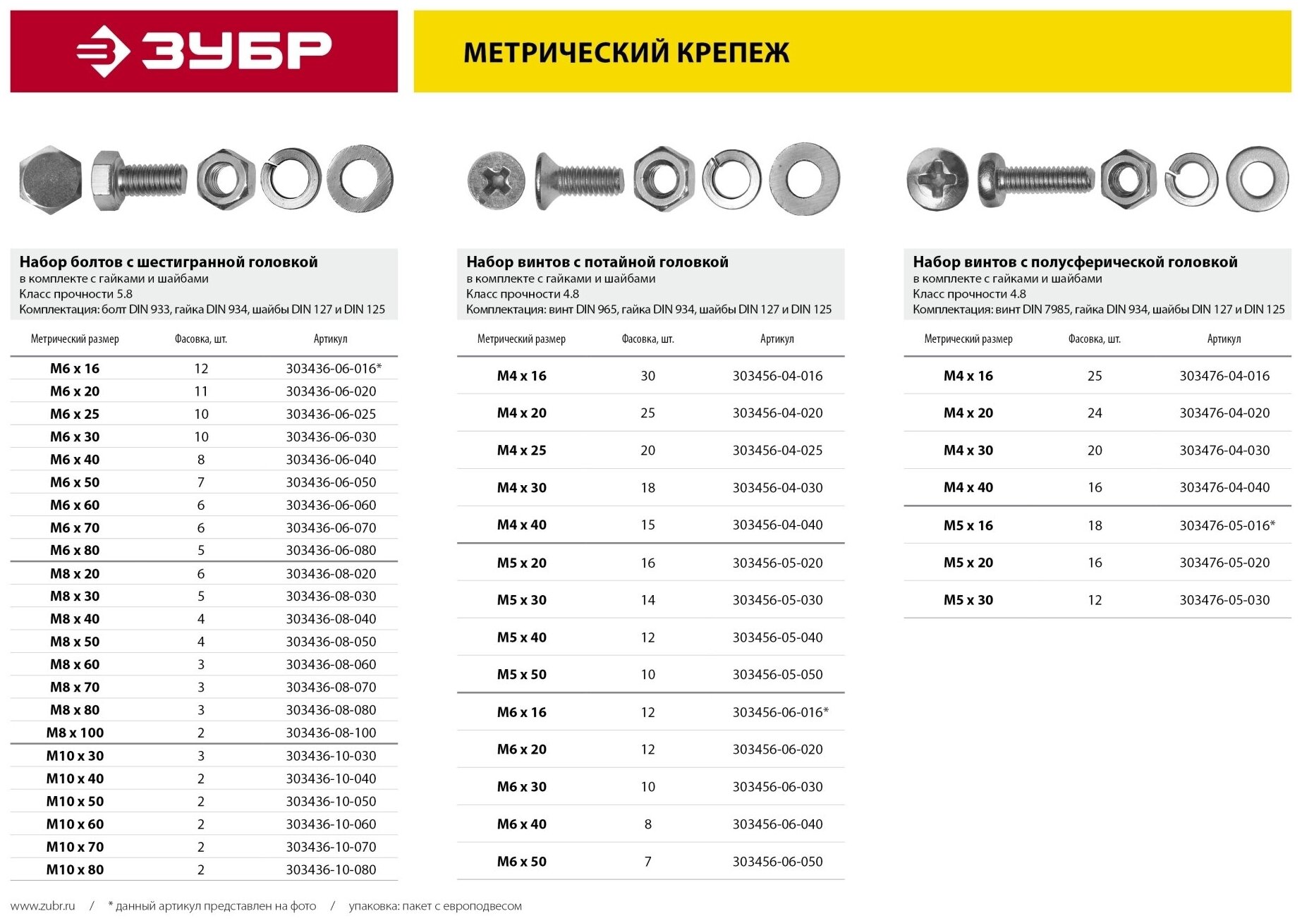 Наборы метрического крепежа изготовлены из высококачественной стали в полном соответствии с действующими стандартами и техническими предписаниями. Находят широкое применение в машиностроении, приборостроении, строительстве, быту и т. д.-Метрическая резьба: М6 -Длина: 16 мм-Тип шлица: PH2 -Шаг резьбы: 1.0 мм-Упаковка: 12 шт.Набор состоит из винтов с потайной головкой DIN 965, гаек шестигранных DIN 934, гроверных шайб DIN 127 и плоских шайб DIN 125;Широко применяются в машиностроении, приборостроении, строительстве, быту и т. д;Винты имеют потайную головку, что позволяет осуществить крепление заподлицо в мягком материале;Класс прочности 8.8 придает конструкции повышенную прочность;Гроверные шайбы предотвращают раскручиваение соединения. Плоские шайбы предназначены для увеличения площади соединения и распределения давления на опорную поверхность;Цинковое покрытие надежно защищает от коррозии и продлевает срок службы изделий.48 шт:-Винт 6х16 мм - 12 шт, -Гайка М6 - 12 шт,-Шайба д.6 мм - 12 шт,-Шайба пруж. д.6 мм - 12 шт.
