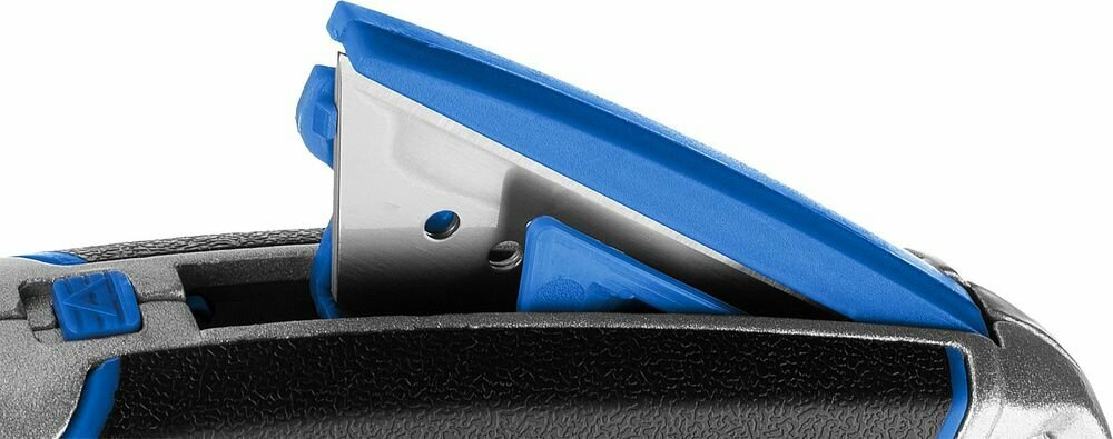 | Прочие особенности и свойства | Используется для работы с линолеумом, ковровыми покрытиями, гипсовыми плитами, пластикой, деревом и т.д. с приложением больших усилий.,Крепкий и надежный захват обеспечивается за счет металлического корпуса и обрезиненной рукоятки.,двойная заточка лезвий;,легкость в демонтаже и монтаже лезвий;,прецизионный механизм, обеспечивающий надежную фиксацию;,встроенный контейнер (кассета) для хранения лезвий |