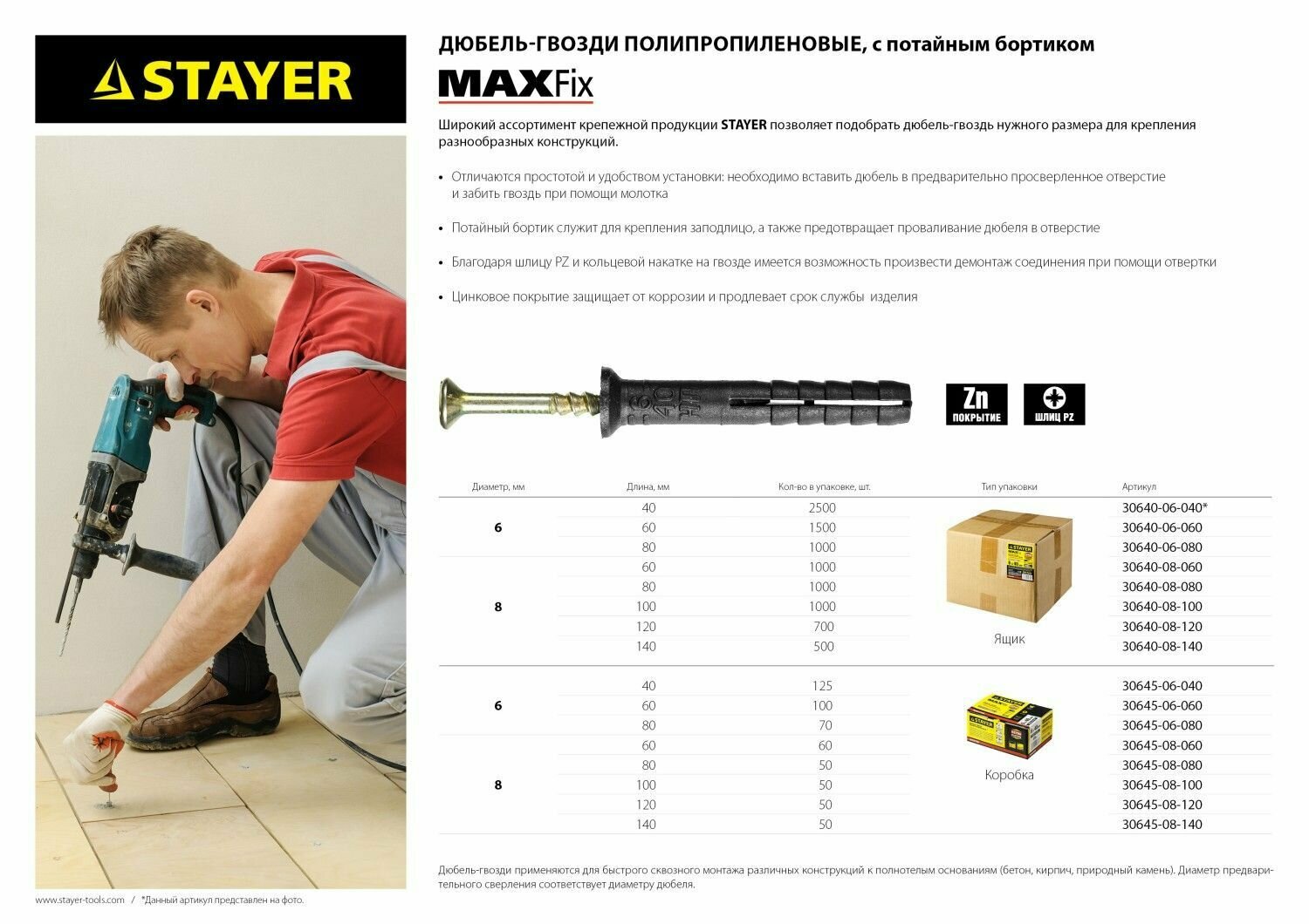 Широкий ассортимент крепежной продукции STAYER позволяет подобрать дюбель-гвоздь нужного размера для крепления разнообразных конструкций.Дюбель-гвозди применяются для быстрого сквозного монтажа различных конструкций к полнотелым основаниям (бетон, кирпич, природный камень).Дюбель-гвозди отличаются простотой и удобством в установке: необходимо вставить дюбель в предварительно просверленное отверстие диаметром 6 мм и забить гвоздь при помощи молотка;Потайной бортик служит для осуществления крепления заподлицо, а также предотвращает проваливание дюбеля в отверстие;Благодаря шлицу PZ и кольцевой накатке на гвозде имеется возможность произвести демонтаж соединения при помощи отвертки;Цинковое покрытие защищает от коррозии и продлевает срок службы изделия.