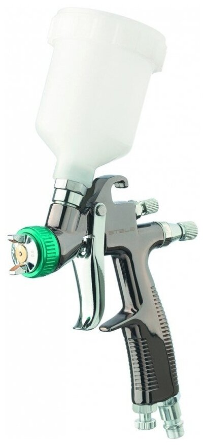 Краскораспылитель STELS системы LVLP (Low Volume Low Pressure — «низкий объём, низкое давление»), с верхним бачком предназначен для нанесения декоративных, покрытий на различные поверхности. Корпус краскораспылителя имеет защитное покрытие из полированного хрома. Объем бачка 120 мл. Расход материала 70-100 мл/мин. Максимальное давление 3,5 бар. Диаметр пневморазъема 1/4 ". В комплекте поставляется универсальный ключ и ершик для чистки.