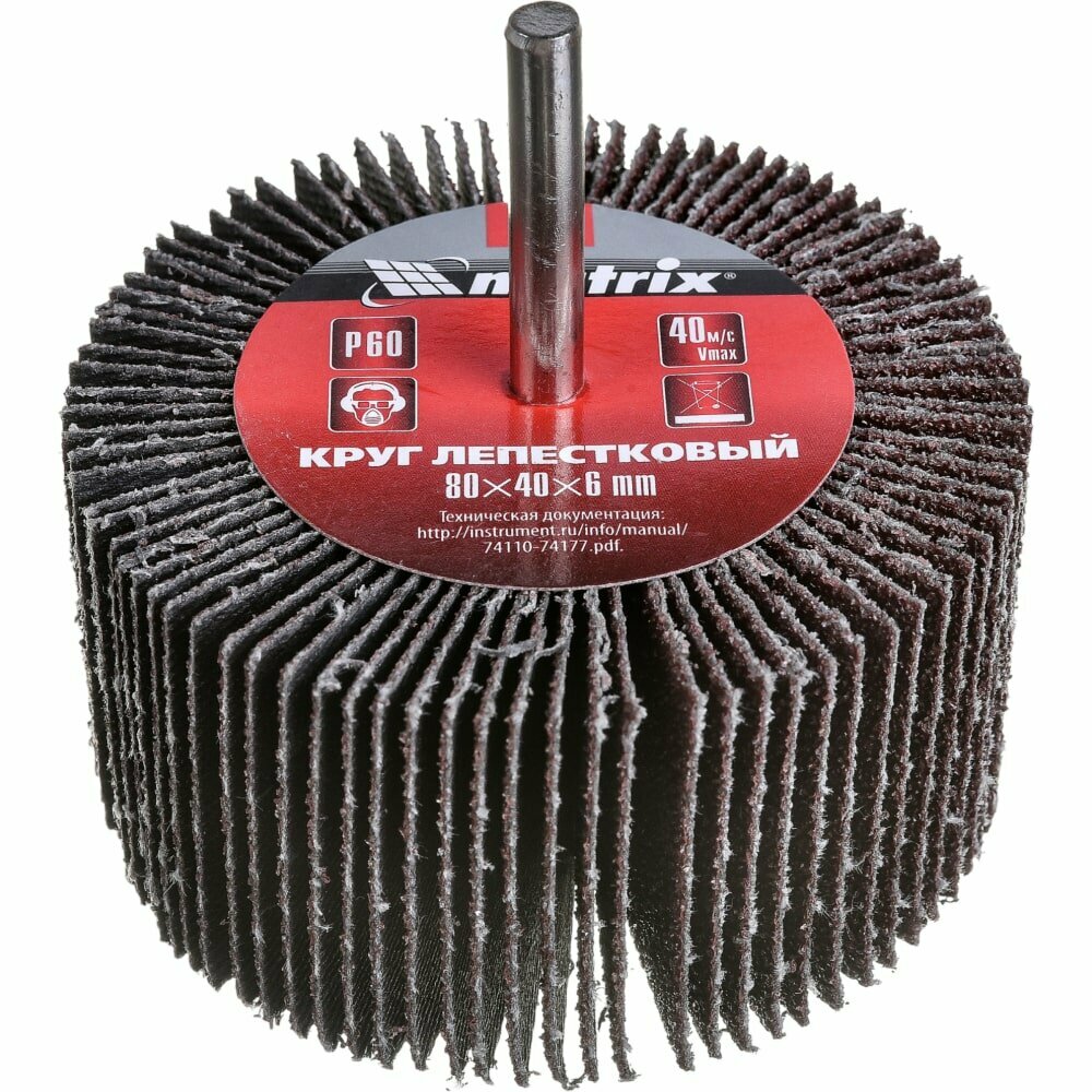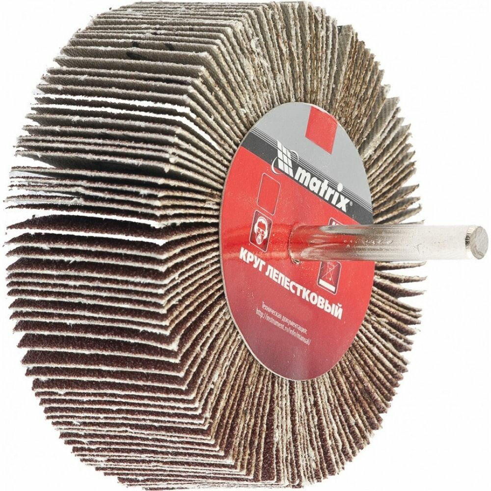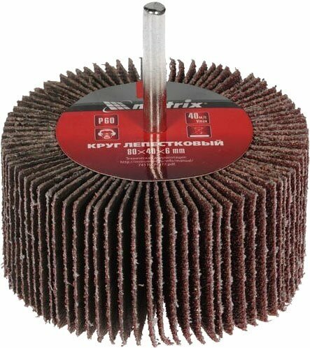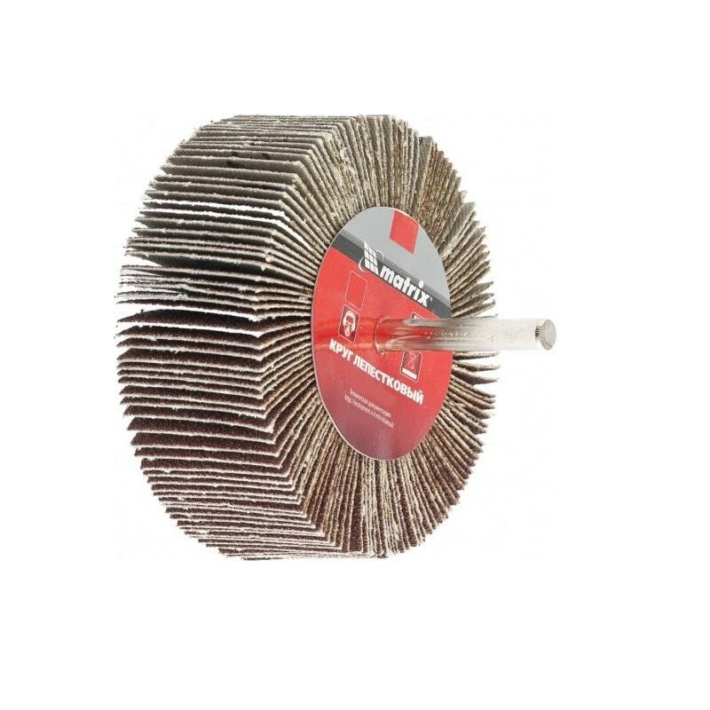 Круг лепестковый для дрелей, шуруповертов MATRIX P 60 (80 х 40 х 6 мм) радиальный изготовлен из лепестков шлифовальной шкурки на тканевой основе, которые радиально расходятся от удерживающего их основания, служащего также хвостовиком.