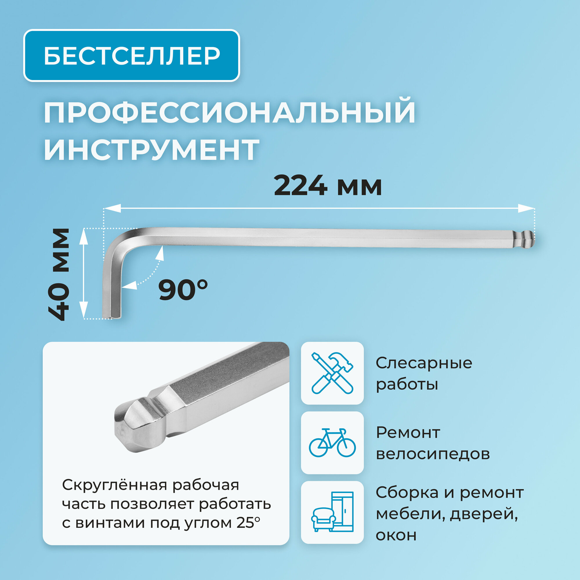 Шестигранный удлиненный с круглой головкой 10 мм ключ. Ключ изготовлен из высококачественной хромованадиевой стали с двойным запасом прочности и повышенной износостойкостью. Твердость стали 55-60 HRC. Максимально точное соответствие размерам крепежа, оптимальная площадь контакта, позволяет осуществлять работу с болтовыми соединениями не повреждая крепеж. Скругленная рабочая часть позволяет работать под углом 25 градусов. Качественное хромирование ключа обеспечивает надёжную защиту от коррозии .