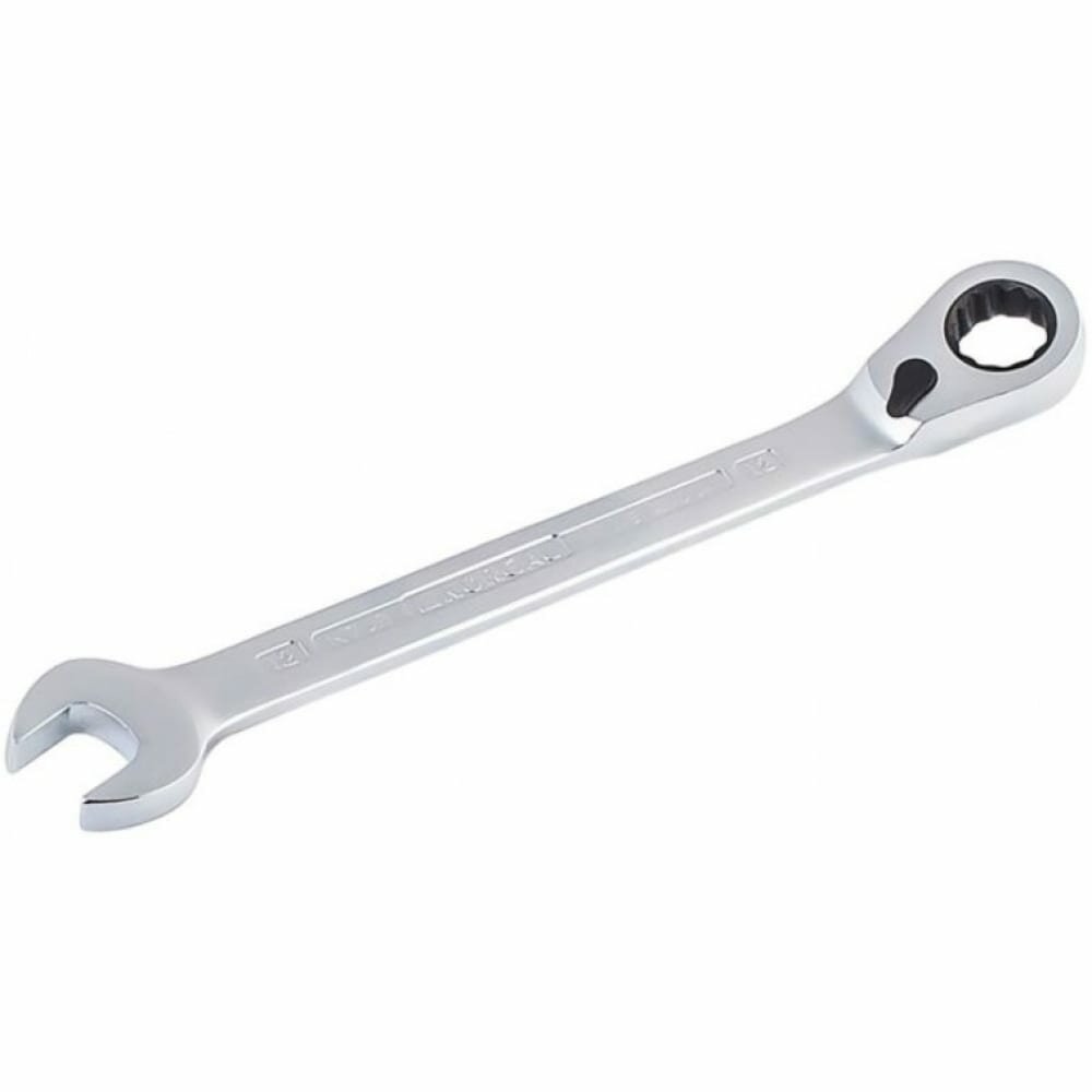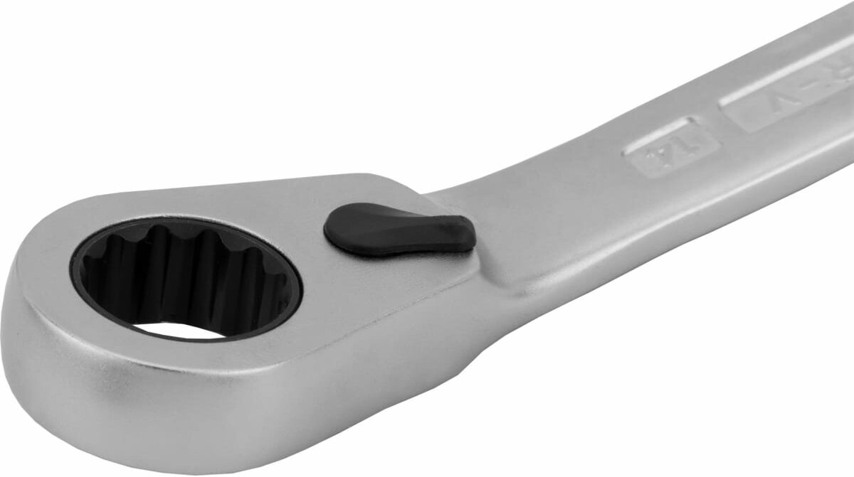 Ключ гаечный комбинированный с переключающейся трещоткой. Накидная часть оборудована реверсивным трещоточным механизмом с углом переключения 5?, что обеспечивает удобство работы в труднодоступных местах. Ключ изготовлен из высококачественной хромованадиевой стали, имеет высокую износостойкость. Максимально точное соответствие размерам крепежа, специальный 12-гранный профиль накидной части, позволяет осуществлять работу с болтовыми соединениями не повреждая крепеж. Двойной запас прочности снижает риск производственных травм. Матовое хромирование поверхности ключа обеспечивает комфортное удерживание ключа в руках в случаях загрязнения смазочными материалами. Губки рожковой части отклонены от оси ключа, накидная часть отклонена от плоскости рукоятки ключа на 15 ?, что позволяет работать в труднодоступных местах. Размер ключа: 14 мм. Длина ключа L, мм: 190