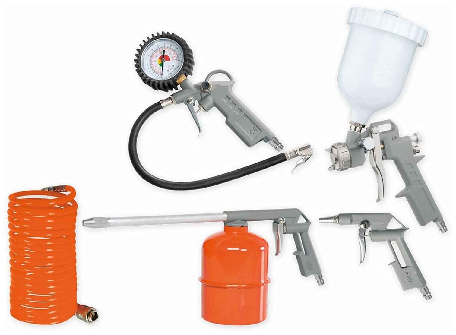 | Состав набора | Насадка для работы со сжатым воздухом, насадка для распыления краски, насадка для распыления жидкости, насадка для подкачки шин, воздушный шланг - 4 метра |