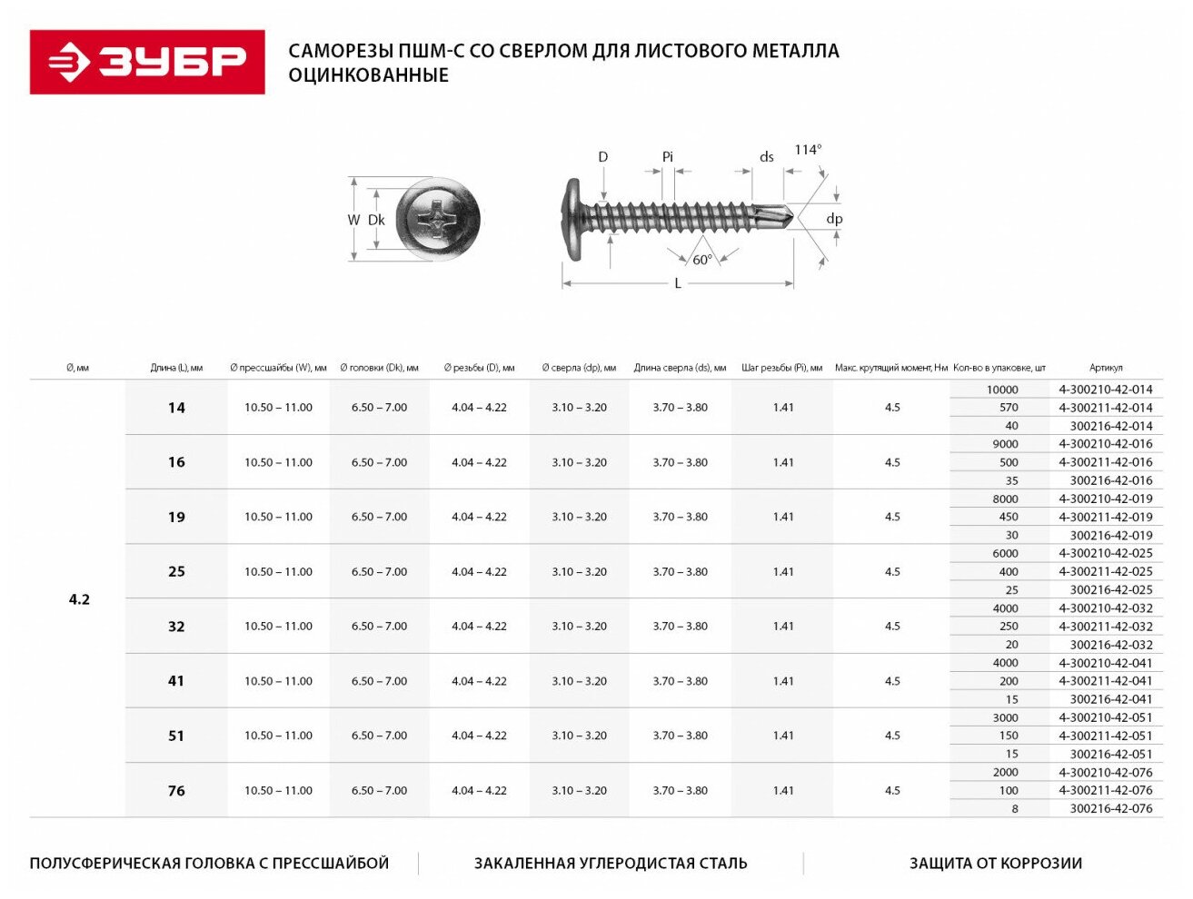 Саморезы с прессшайбой и сверлом по листовому металлу ЗУБР 300216-42-032