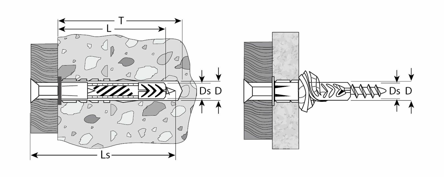 Применение - для монтажа элементов и конструкций к полнотелым (бетон, кирпич, природный камень), пустотелым (кирпичи с пустотами, блоки и т.п.) и тонкостенным (фанера, ДСП, гипсокартон и т.п.) строительным материалам. Фиксация дюбеля происходит при вкручивании в него самореза (входит в комплект поставки)