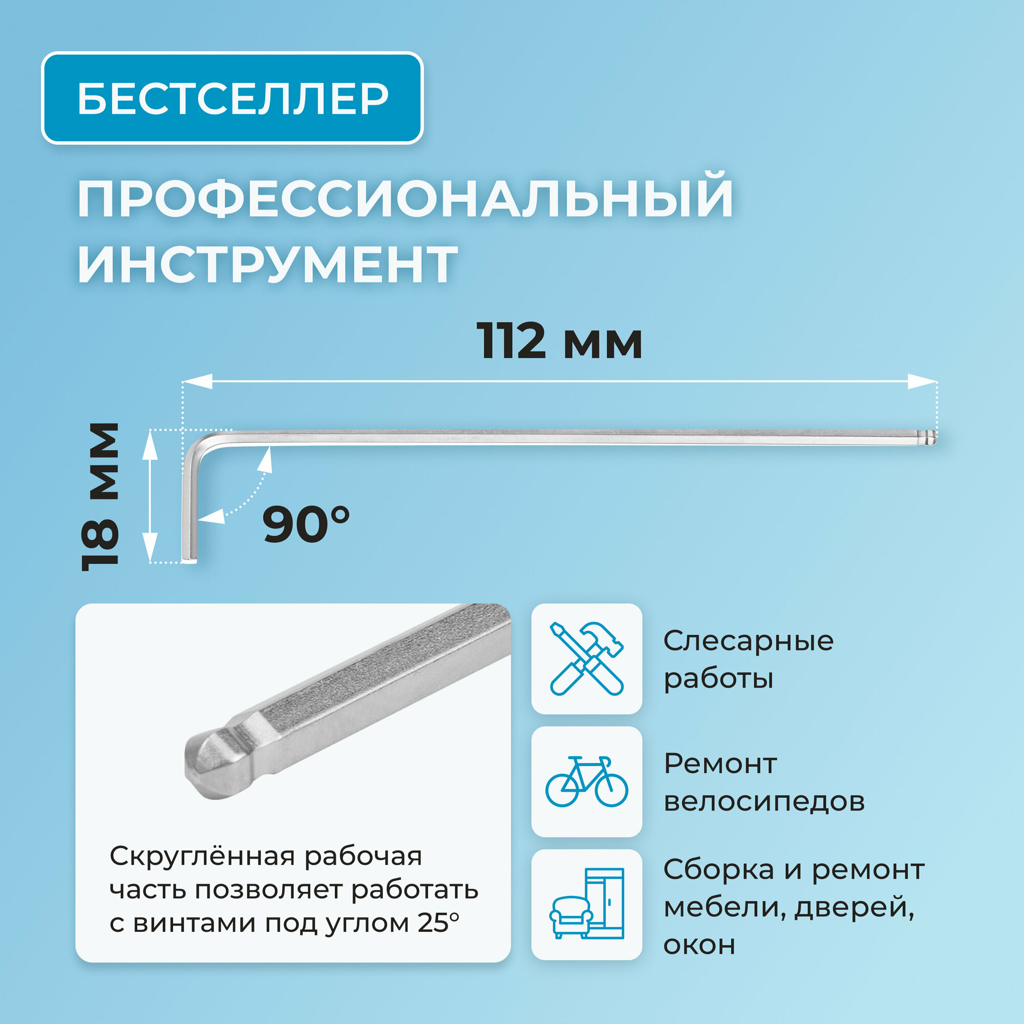 Удлиненный шестигранный ключ NORGAU Industrial предназначен для слесарных работ, монтажа/демонтажа резьбовых соединений. Используется при сборке и ремонте мебели, дверей, пластиковых окон, велосипедов. Имбусовый ключ популярен для оснащения автомастерских и производственных цехов. Особенности инструмента: Скругленная рабочая часть Г-образного ключа позволяет работать с винтами под углом 25°.Шестигранник выполнен из высококачественной хромованадиевой (CrV) стали: способен выдерживать большие рабочие нагрузки.Хромирование надежно защищает инструмент от появления коррозии.Шестигранный профиль ключа обеспечивает равномерное распределение усилия на грани шлица при затягивании крепежа.Твердость стали: 55-60 HRC. Благодаря этому ключ не деформируется, не проворачивается в шлице в процессе затяжки, не повреждает винты и саморезы. Удлиненная форма инструмента позволяет добраться до труднодоступных мест. Характеристики:Размер: 2,5 мм.Длина: 112 мм.