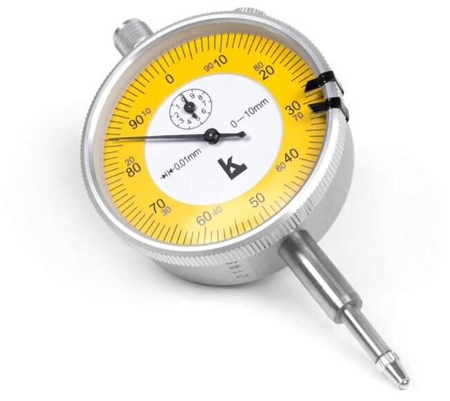 Индикатор часового типа Калиброн предназначен для измерения линейных размеров абсолютным и относительным методами, определения величины отклонений от заданной геометрической формы и взаимного расположения поверхностей. Тип ИЧ характеризуется перемещением измерительного стержня параллельно плоскости расположения шкалы. Большинство моделей являются многооборотными – имеют большую круговую шкалу и малую, которая отвечает за количество полных оборотов большой шкалы, то есть фиксирует количество целых миллиметров. Принцип работы прибора основан на преобразовании возвратно-поступательного движения измерительного стрежня во вращательные движения стрелки индикатора, что осуществляется за счет реечно-зубчатой и шестереночной передачи. Крепление индикатора ИЧ возможно за ушко с присоединительным отверстием. Индикатор выполнен из закаленной стали, измерительная поверхность покрыта твердым сплавом.