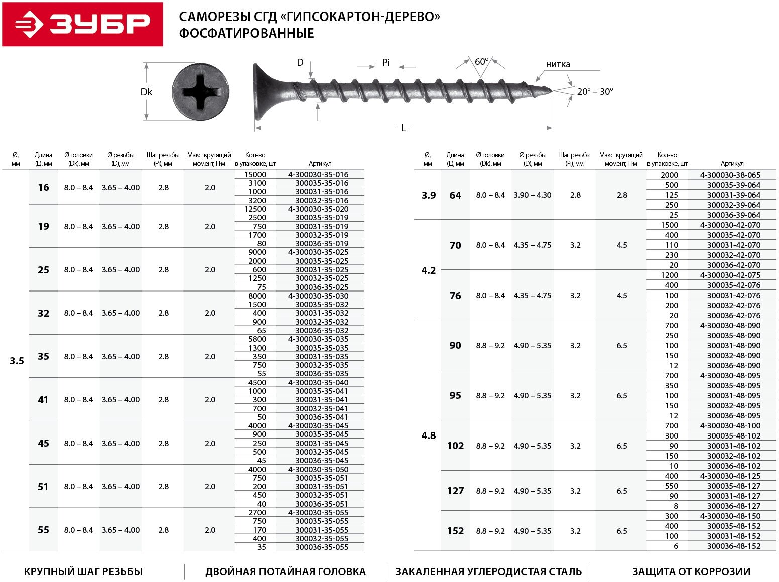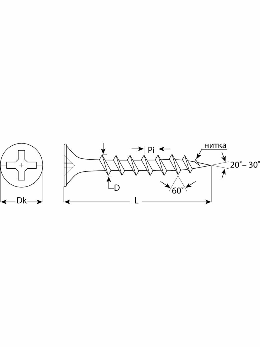 | Прочие | Крупный шаг резьбы оптимален для крепления к деревянной обрешетке и не допускает повреждения волокнистой структуры дерева., , Двойная потайная головка утапливается в гипсокартон заподлицо. |