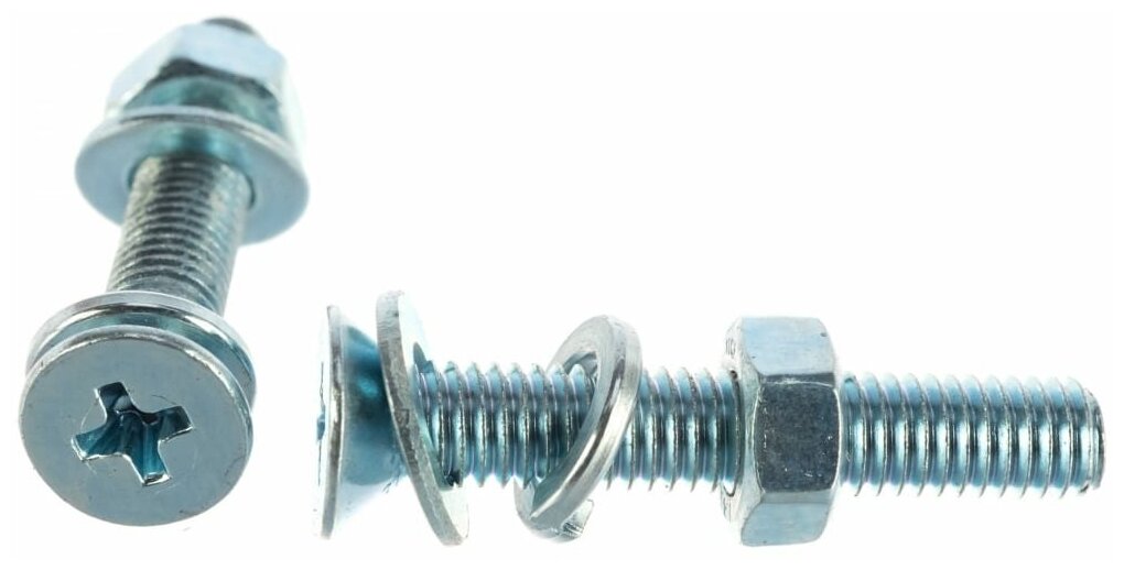 Винты имеют потайную головку, что позволяет осуществить крепление заподлицо в мягком материале. Пружинные шайбы предотвращают раскручивание соединения. Плоские шайбы предназначены для увеличения площади соединения и распределения давления на опорную поверхность. Класс прочности 4.8 обеспечивает жесткость конструкции. Цинковое покрытие надежно защищает от коррозии.