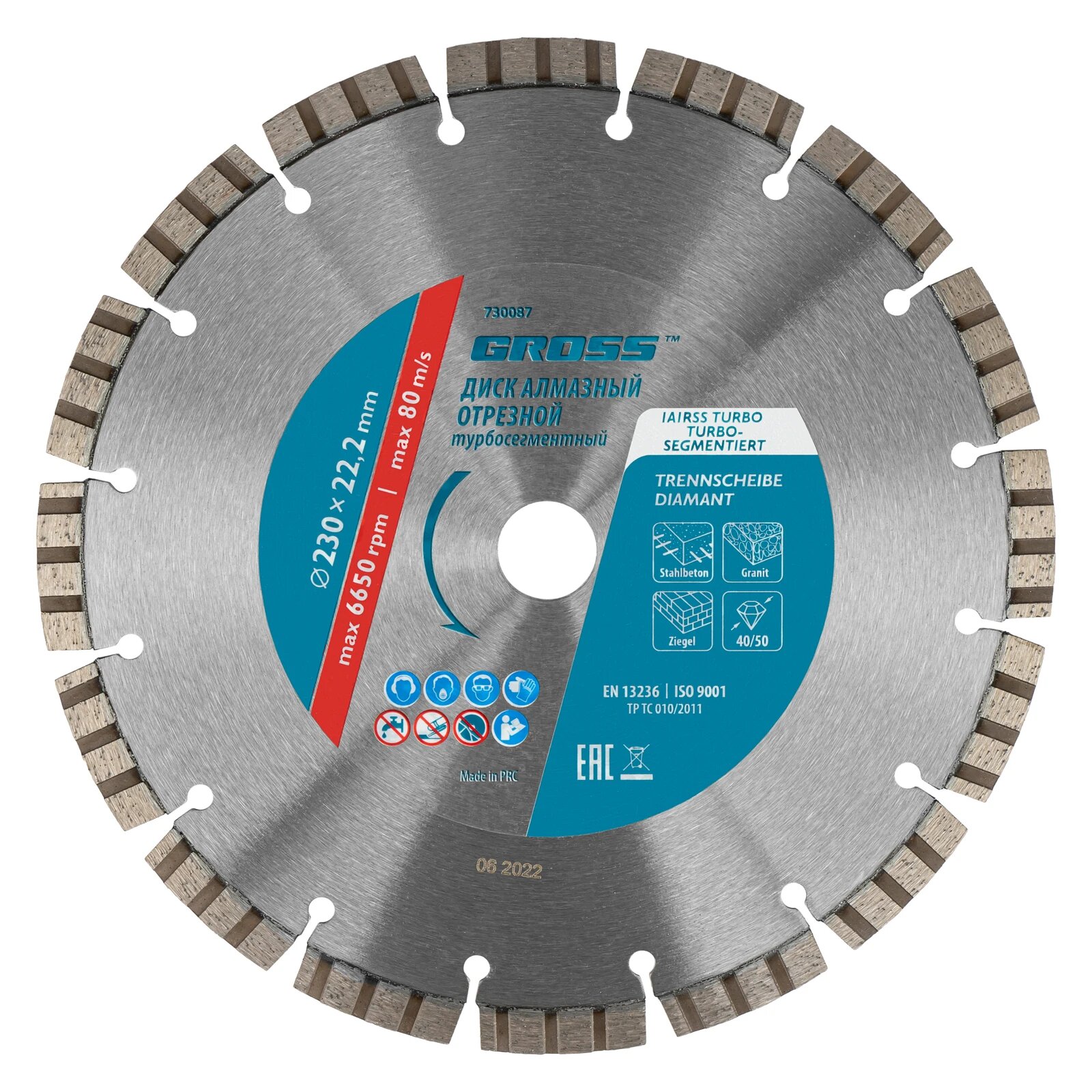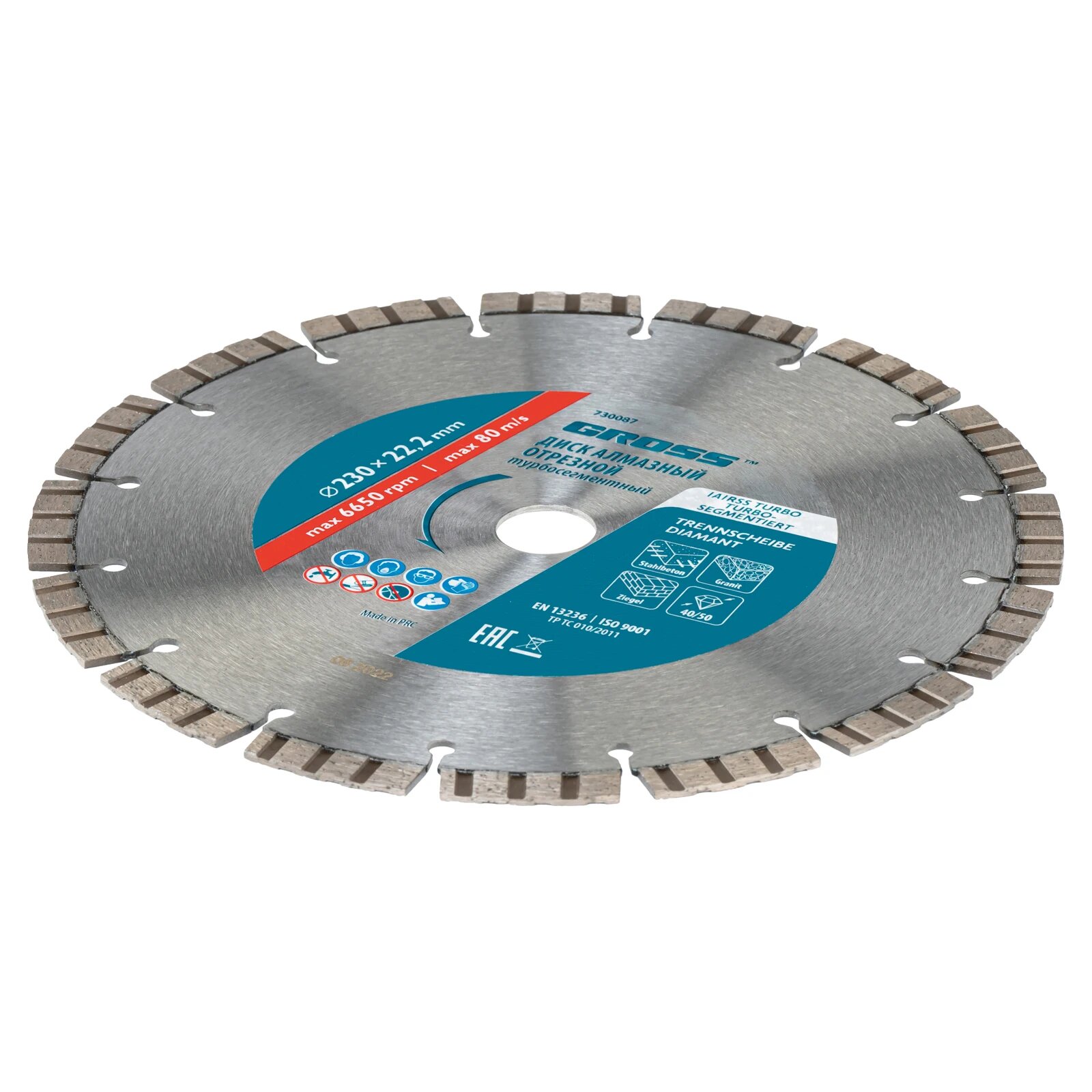 Алмазный диск Gross диаметром 230 х 22,2 мм с лазерной приваркой турбо-сегментов предназначен для сухого резания бетона, в том числе свежего, слабоармированного железобетона, кирпича, песчаника и гранита. Посадочный диаметр 22,2 мм позволяет использовать диск в качестве оснастки для УШМ. Турбо-сегментное строение обеспечивает быстрое сухое резание без необходимости водяного охлаждения. Благодаря оптимально подобранной связке диск выдерживает высокие нагрузки при выполнении большого объема работ. Подходит как для интенсивного бытового, так и для профессионального применения..