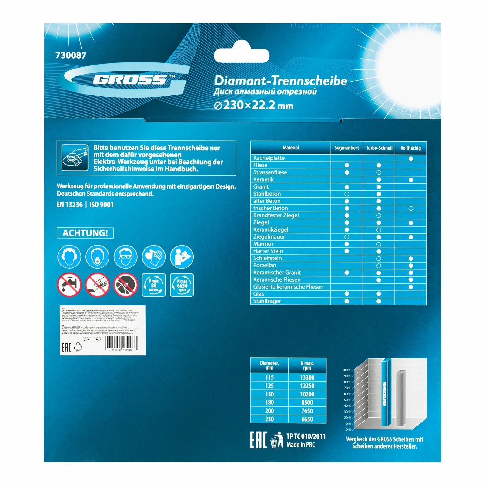 Сделать ровный срез изделия станет гораздо проще, если под рукой окажется отрезной диск GROSS . Благодаря наличию алмазного покрытия это изделие показывает высокую эффективность и качество работы, а также оно надежно защищено от негативного воздействия окружающей среды.