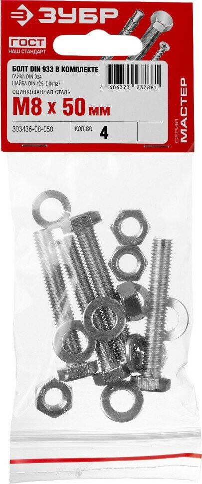 Болт ЗУБР (DIN933) в комплекте с гайкой, шайбой, шайбой пруж., M8 x 50 мм, 4 шт