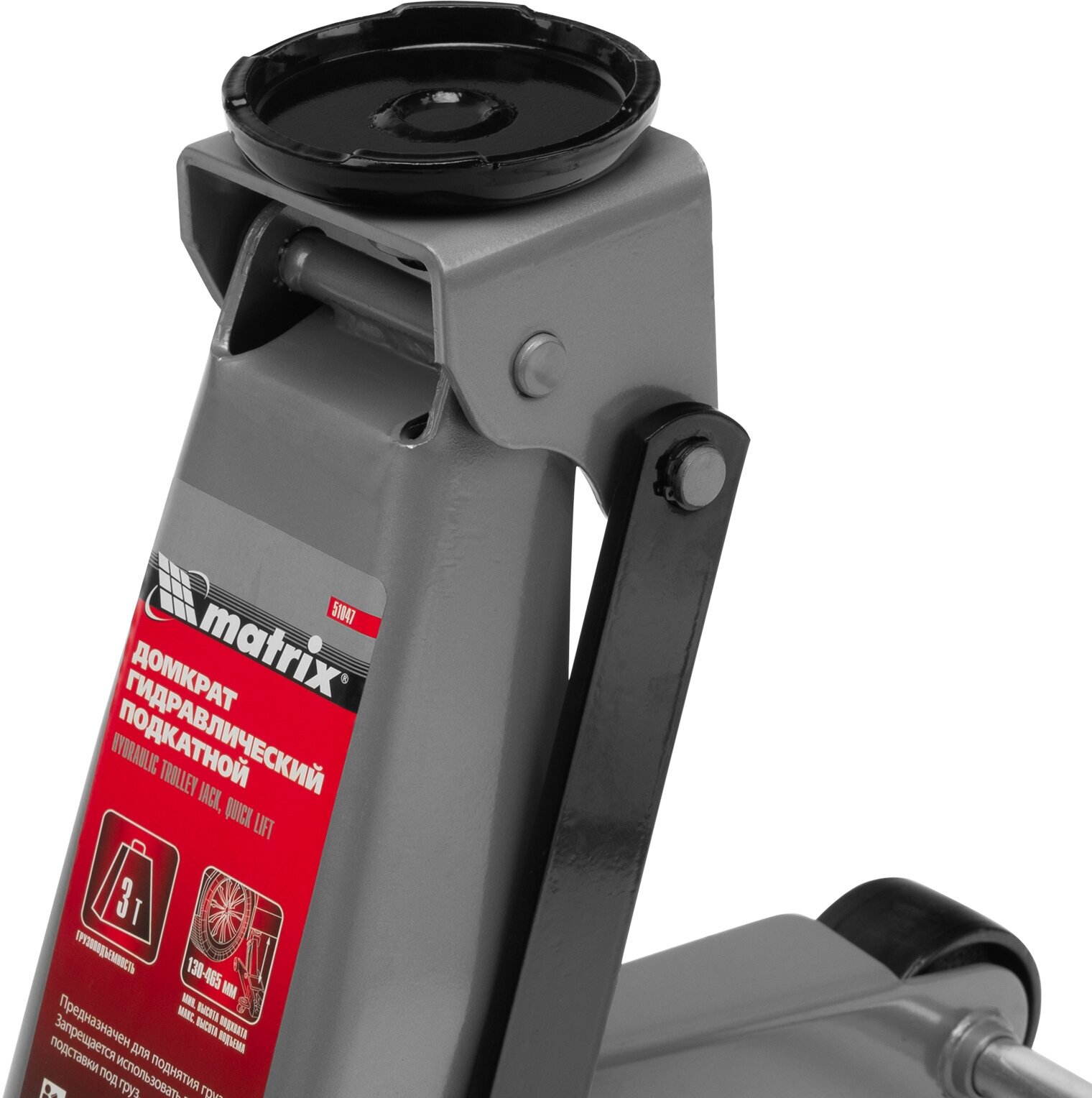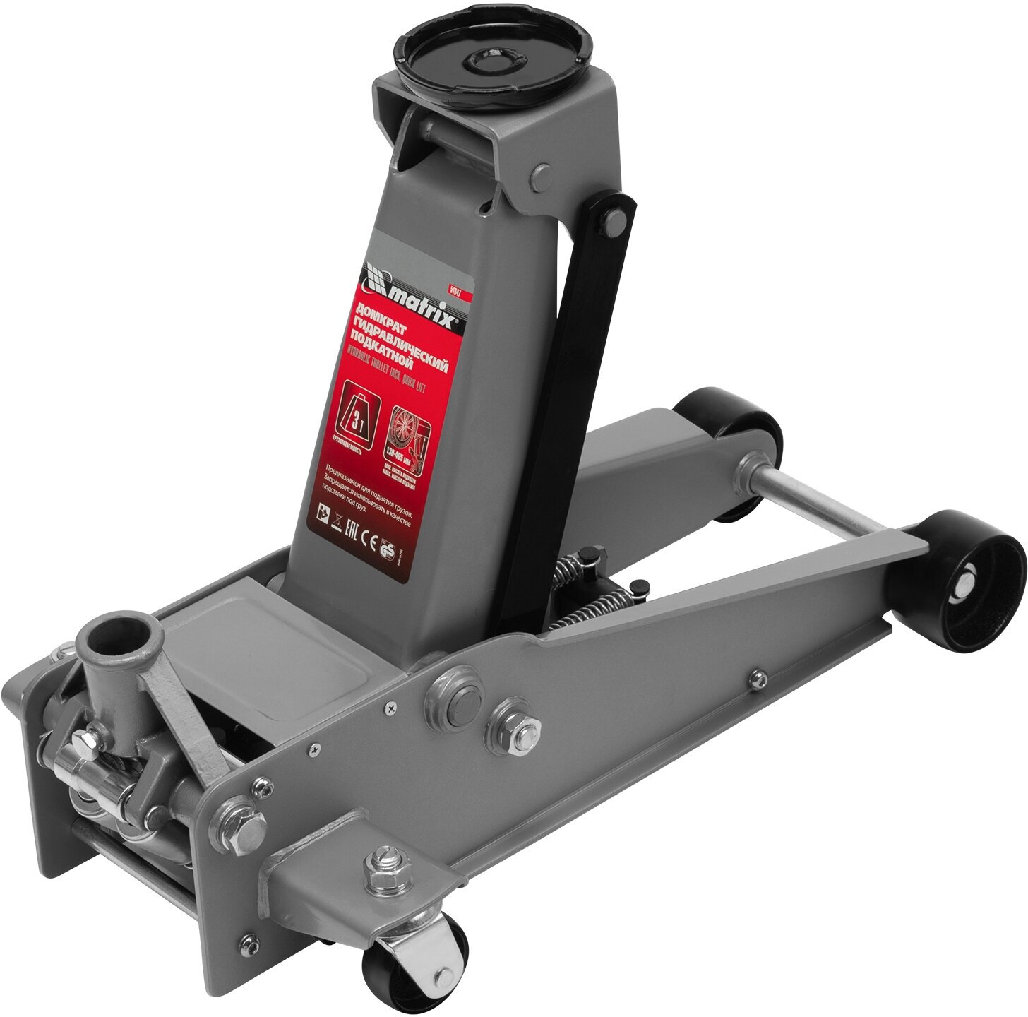 Профессиональный подкатной домкрат торговой марки MATRIX предназначен для обслуживания любых типов легковых автомобилей.Оснащен домкрат системой быстрого подъема рабочей части QUICK LIFT позволяющей поднять опорную площадку за 10 полных качков рукояткой.